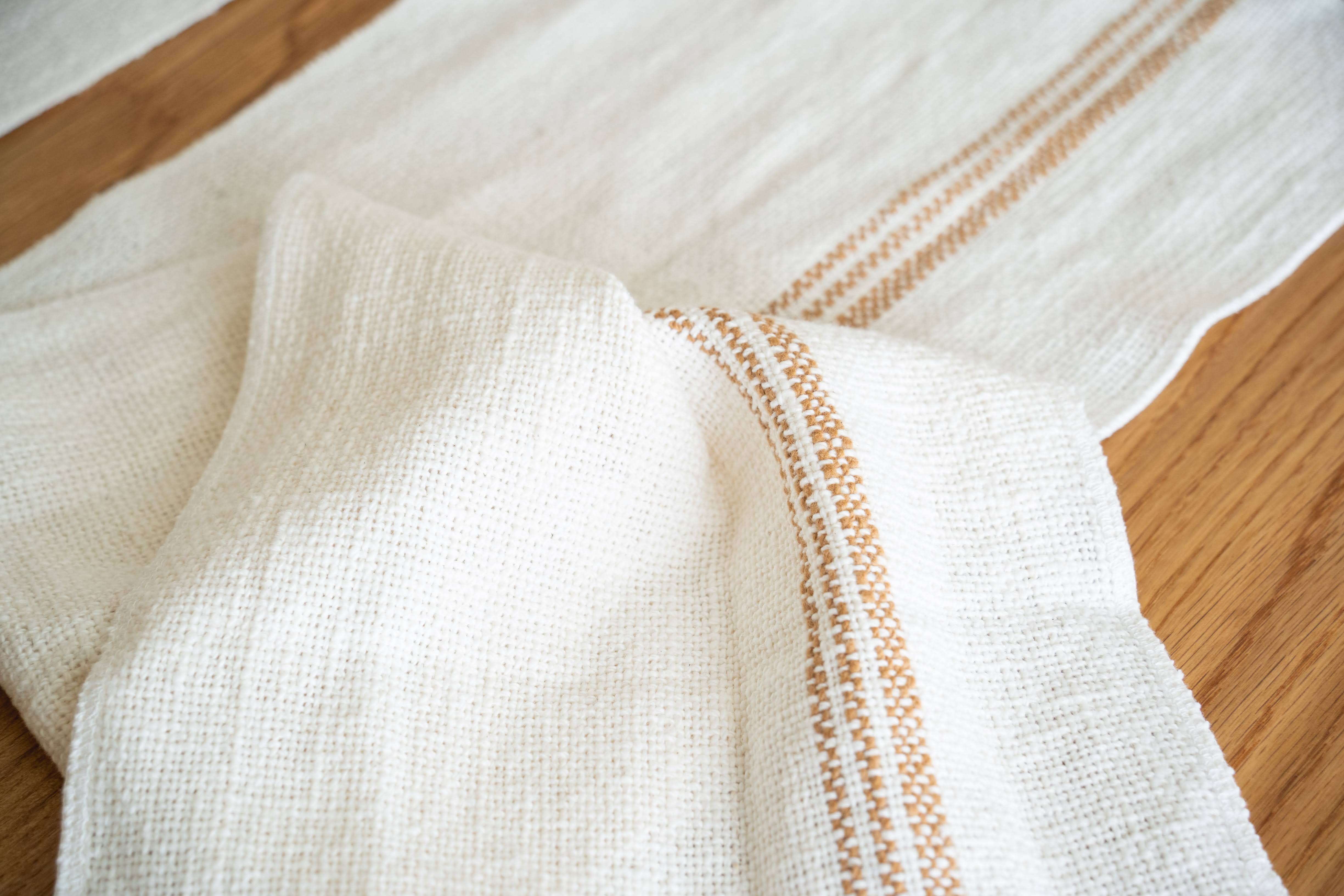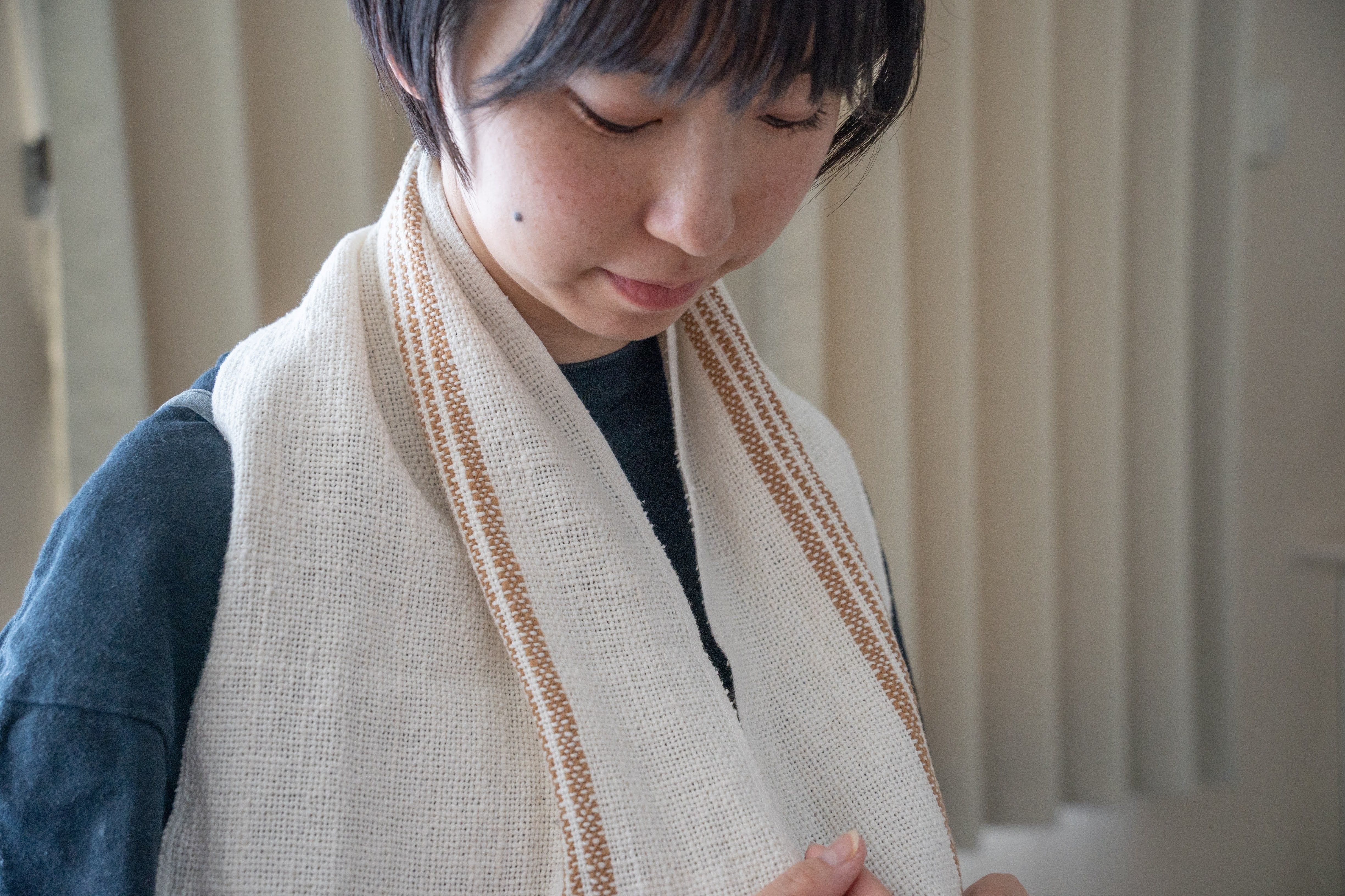 太さが均一でない手紡ぎの糸を荒く織り上げているため、布の表面にふっくらした凹凸があり、触れたときのやさしい肌触りが生まれます。