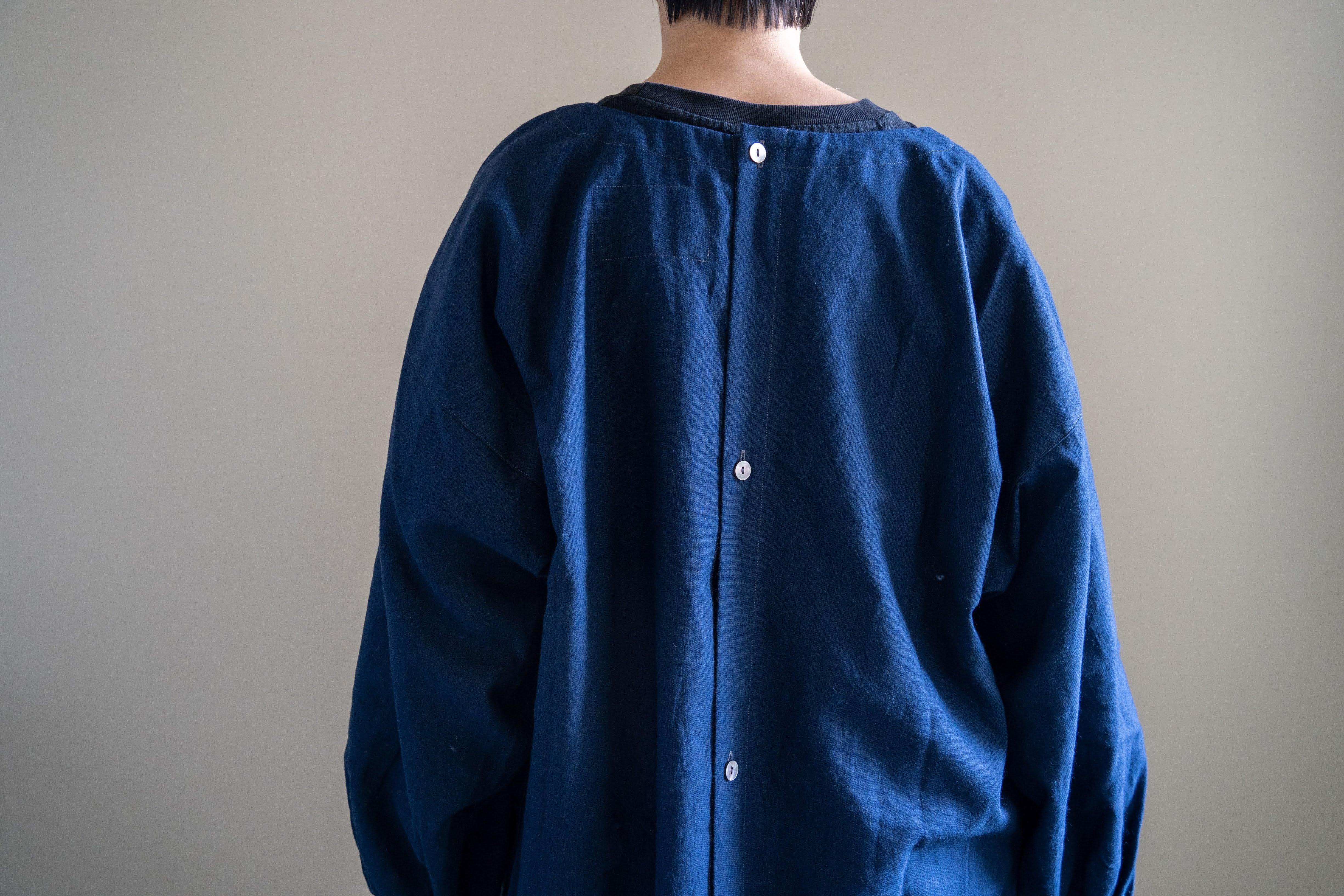 割烹着の背中側は貝ボタンで留めるデザイン。