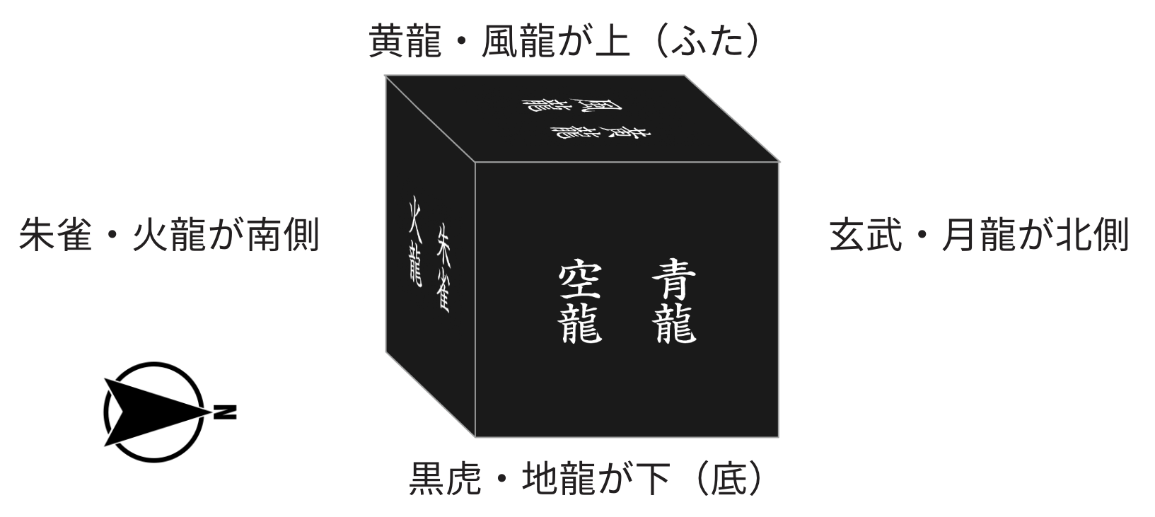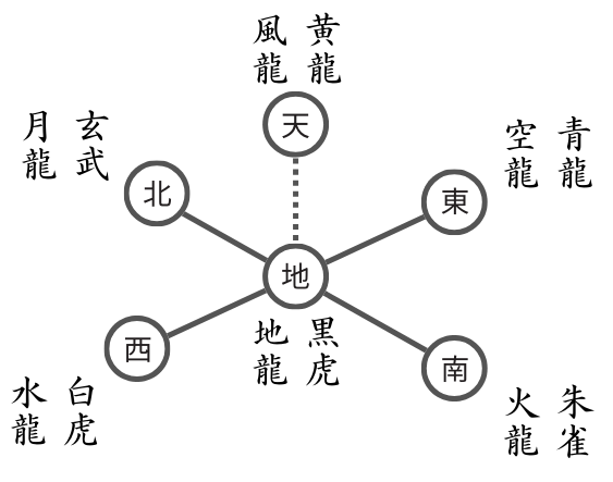 「青龍、朱雀、白虎、玄武、黄龍、黒虎」は六神獣と呼ばれる方位の守り神です。