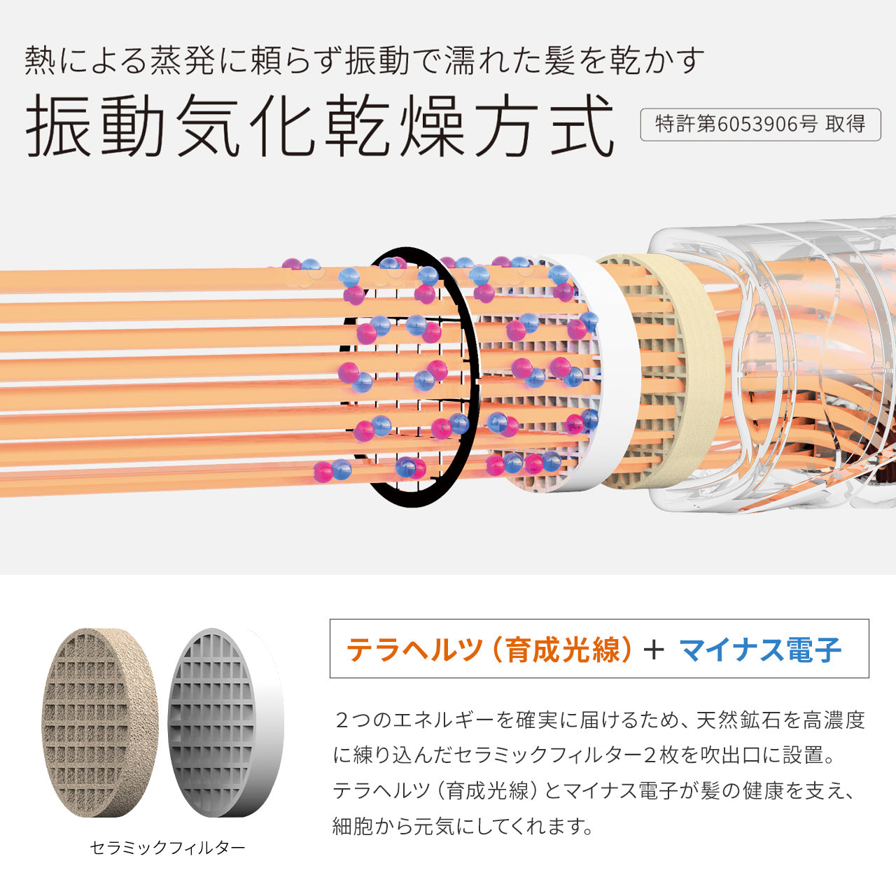 「育成光線」と呼ばれる遠赤外線を放出します。これが髪の内側から水分を振動させて、水分を吹き飛ばすように、スピーディーに乾かします。
