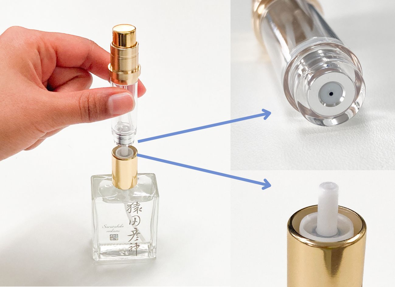 3.アトマイザーの底を香水ビンのノズルにあてて、ポンプを押すように上下に押し込みます。