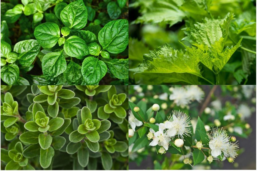 ▲写真左上/マージョラム、右上/シソ、左下/パチュリ、右下/マートル