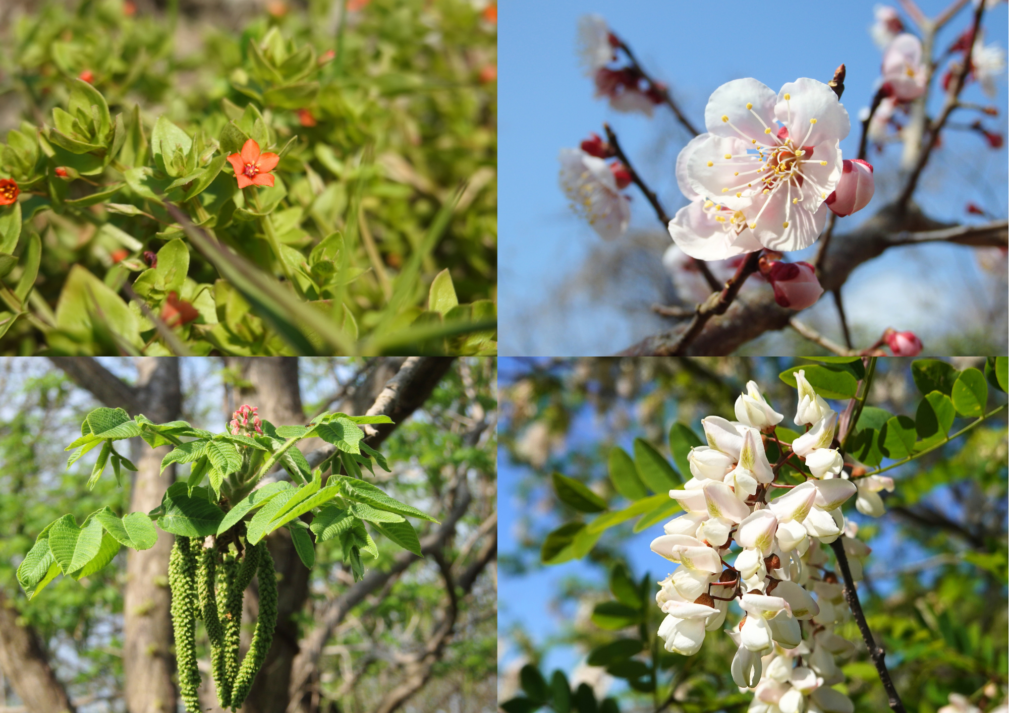 使用している花→アカバナルリハコベ(左上)、ウメ(右上)、オニグルミ(左下)、ハリエンジュ(右下)
