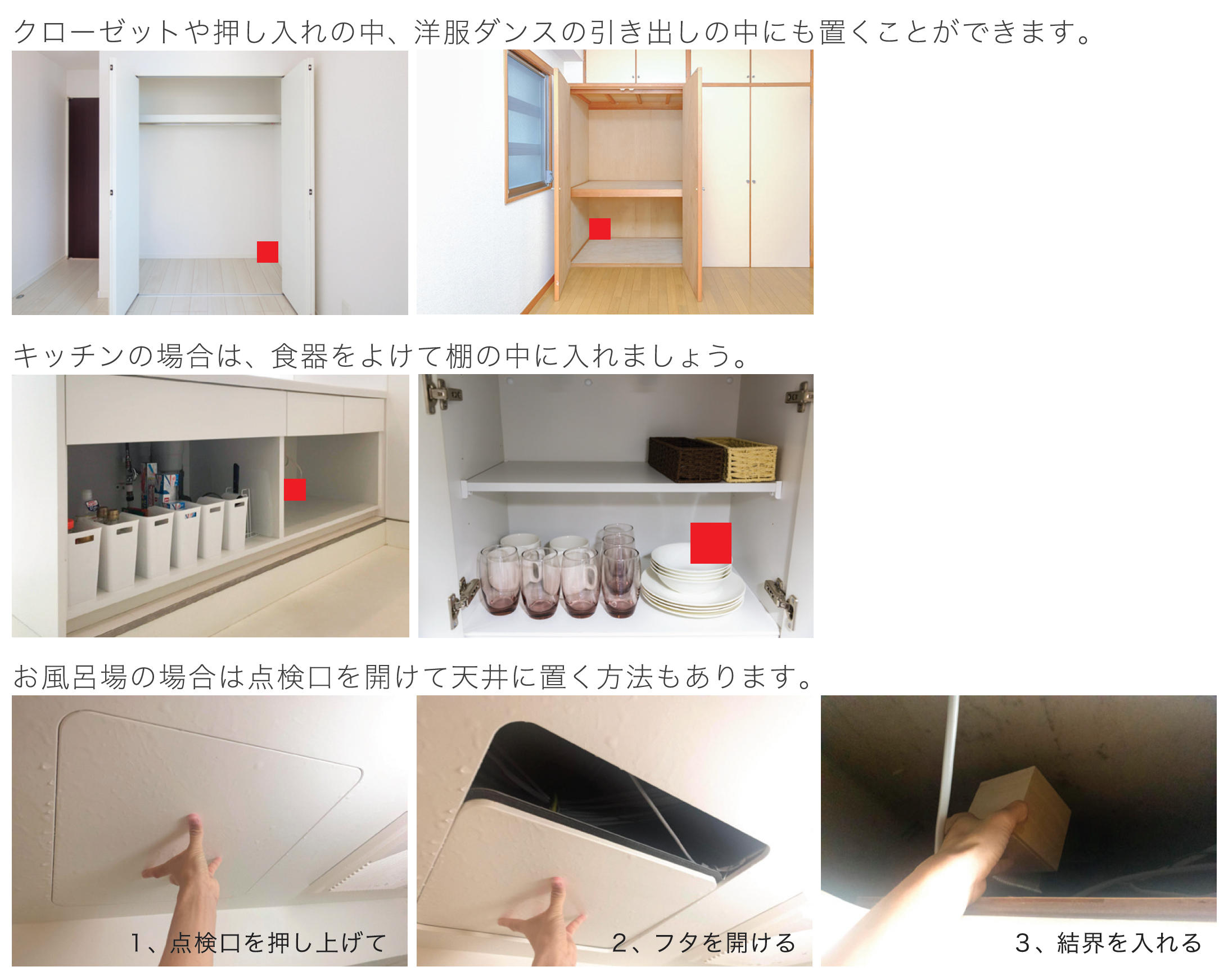 4つの箱は、おおよその高さをそろえて設置してください。(1~2mほどの差であれば、問題はありません。)神棚のように高いところや、家具の上やクローゼットの中などに置いていただいても結構です。