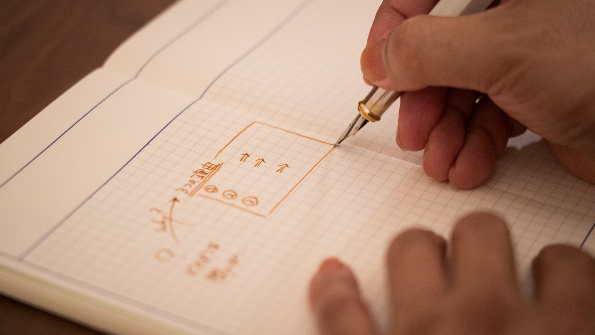 「脳の取説」といわれるNLPの考え方に、VAK(Visual:視覚、Auditory:聴覚、 Kinetic:身体感覚)モデルというものがあります。これをノートに適用し、たとえば、ブルーフレームがもたらす視覚的効果や、理想の紙のペンを走らせる音(聴覚)、ページをめくる・ふれる、紙の上でペンを動かす身体感覚の心地よさを考慮してつくられています。