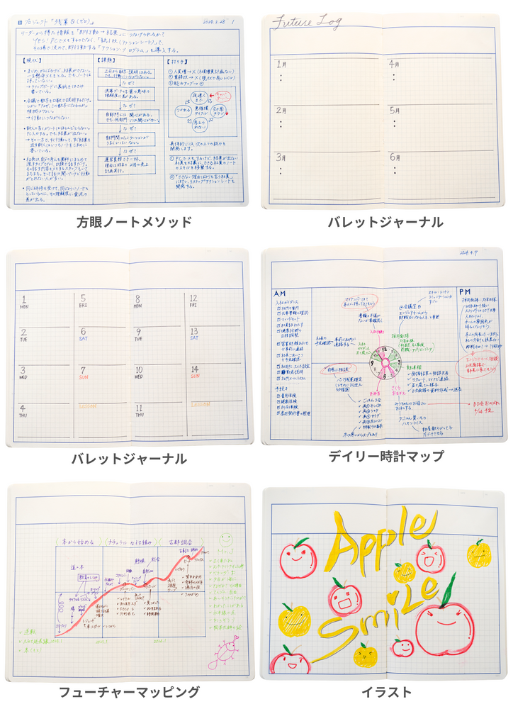 絵や写真も枠(フレーム)があることで、見やすさ、絵や写真の実感が格段に上がりますが、ノートも同じです。枠(フレーム)で外と内の境界線をつくるだけで、内側に書かれる情報の見やすさ、書きやすさの実感が増します。 マインドマップ、方眼ノートメソッド、フューチャーマッピングをはじめ「全体思考」や「論理的思考」をする上で必須な見開き1ページ設計が、思考と記憶の質とスピードをアップします。