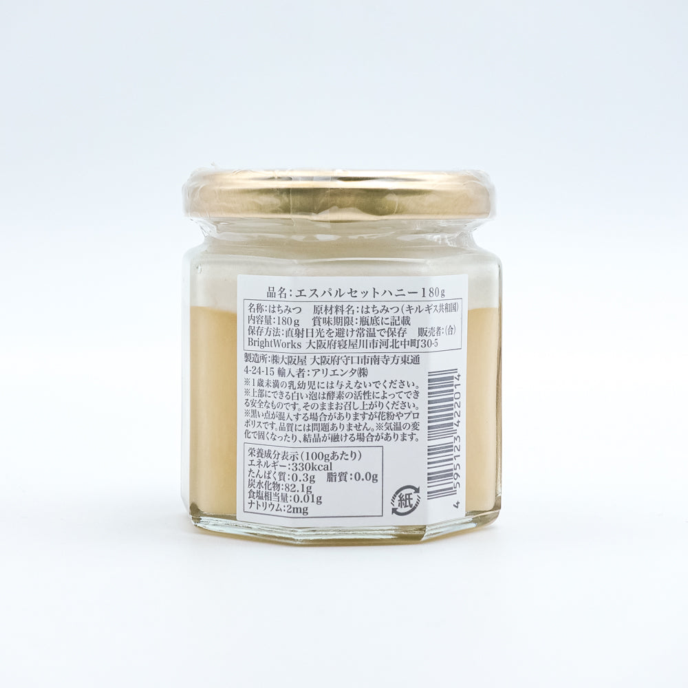 エスパルセットハニーは、中東とアジアの間にあるキルギス共和国のはちみつで、かなりエネルギーのあるハチミツです。僕も最近愛用しているおすすめ商品です。小腹が空いたな、という時に、最近はケーキ1個食べるというより、コーヒーとともに、このハチミツをティースプーン1杯食べるという組み合わせをしていますが、最高です。ハチミツ自体希少なもので、エネルギーもすごく高いので、それだけで満たされます??パンにつけたり、ヨーグルトにいれてもおいしいですが、ぼくは、スプーン一杯をゆっくり口の中で溶かすのが、おすすめです。普通のはちみつとは違い、花の香りが広がります。まるで、花とキスしてるような気分になりますね?..(笑)