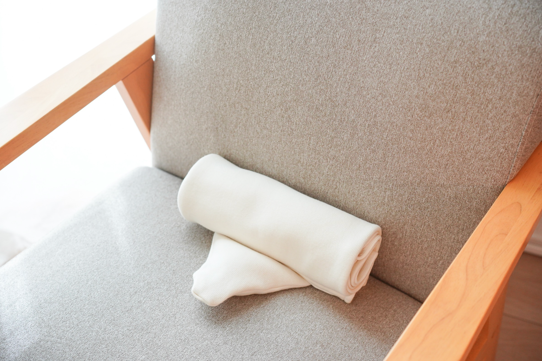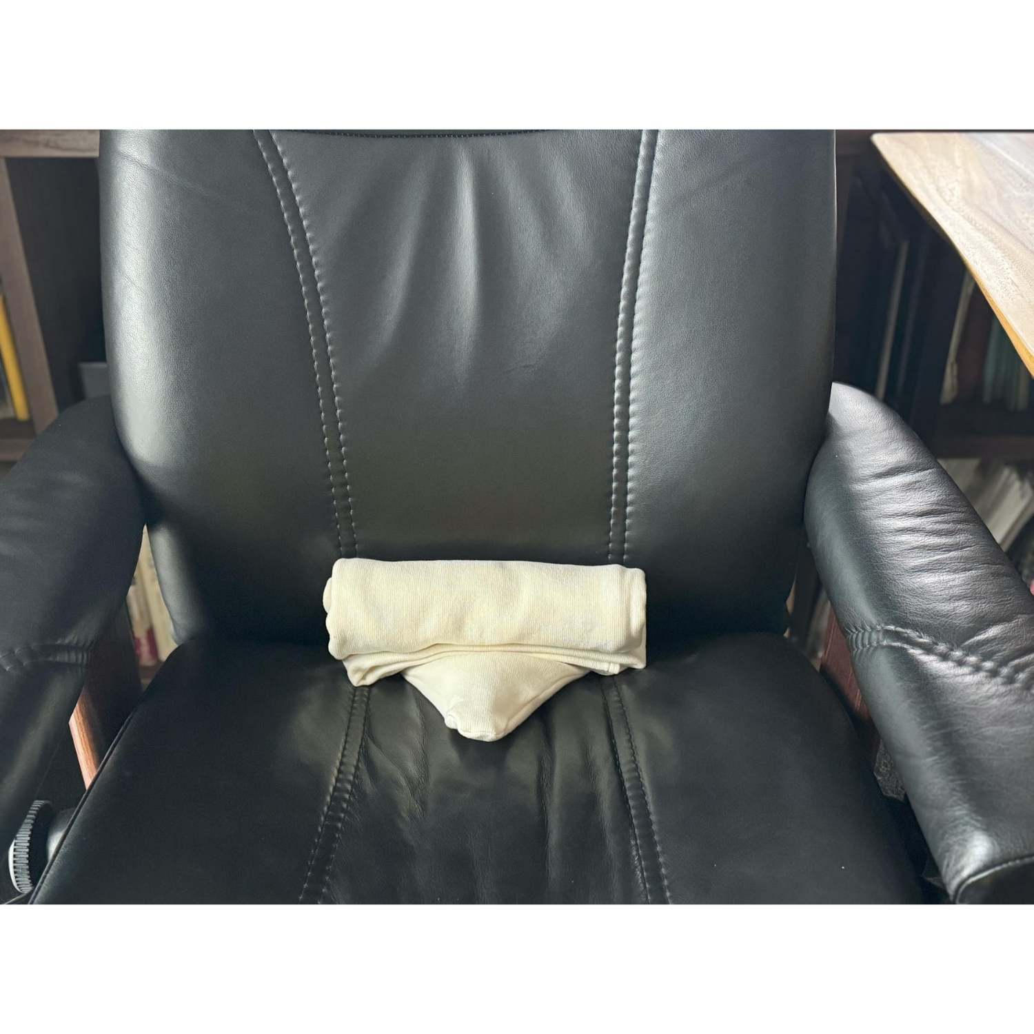 長時間のデスクワークや車の運転などをされる場合は、長方形部分の生地の部分を丸めて三角枕が仙骨(骨盤の中央にある骨)に当たるように座ってください。骨盤が立つことで背骨のS字カーブを保つことができ、自然と疲れない姿勢になります。腰の負担が少なくなるので、腰痛が気になる方におすすめの使い方です。