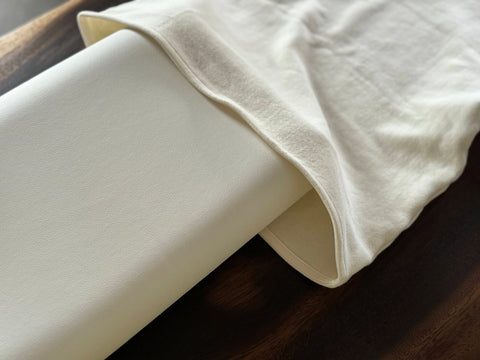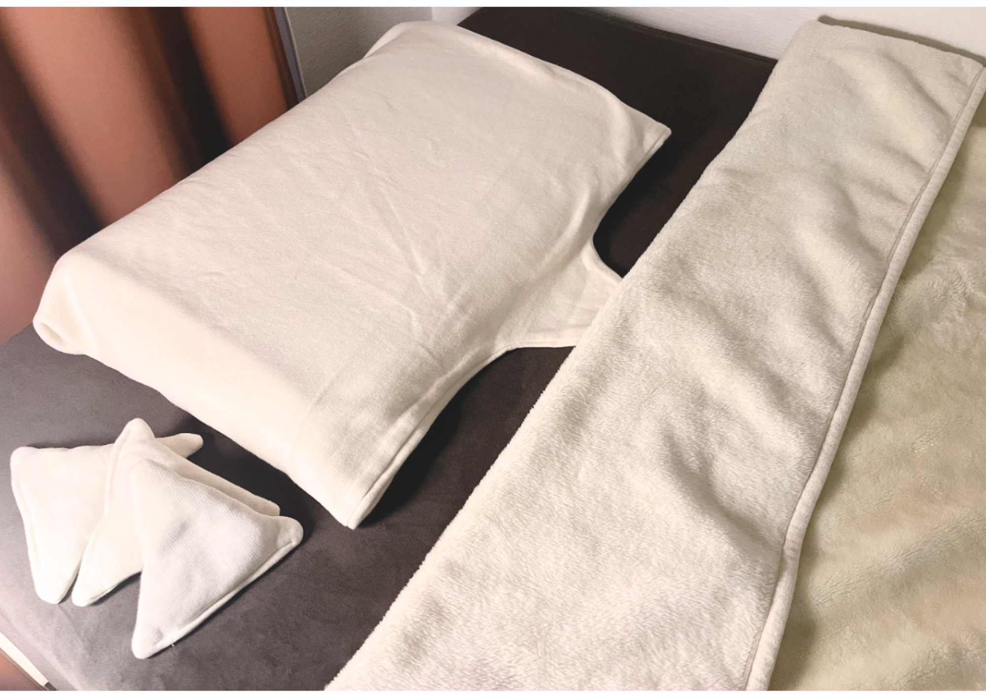 付属の三角枕にて、パッドの枚数を調整することができ、厚みを調整できるようになっていますので、その時々の使用目的に合わせて調節しお使いください。