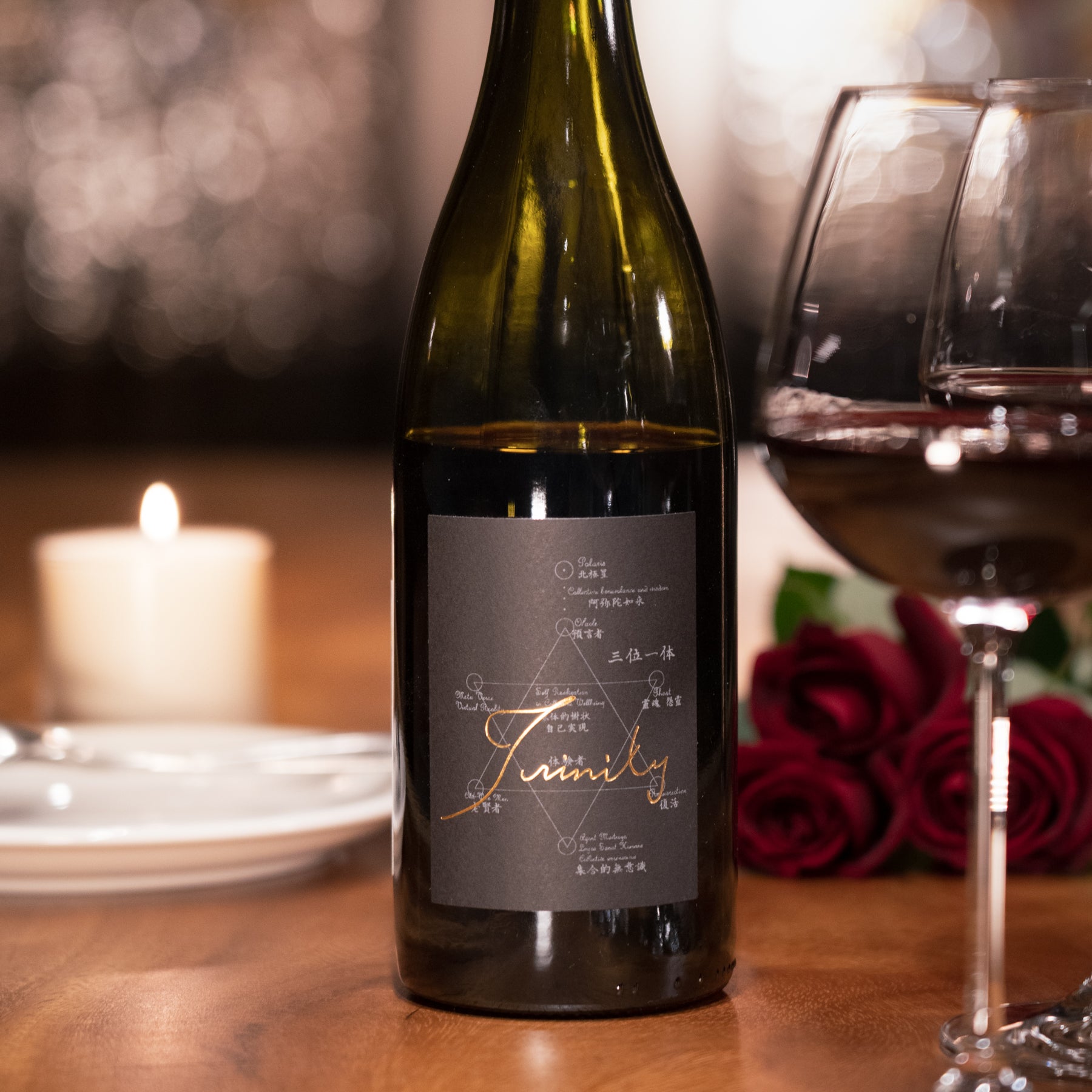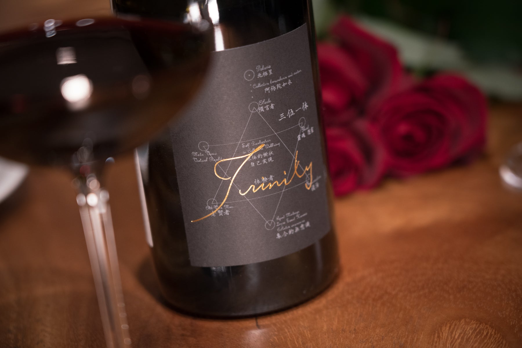 ラベルに描かれた「TRINITY」の書は、北極老人の手によるもの。