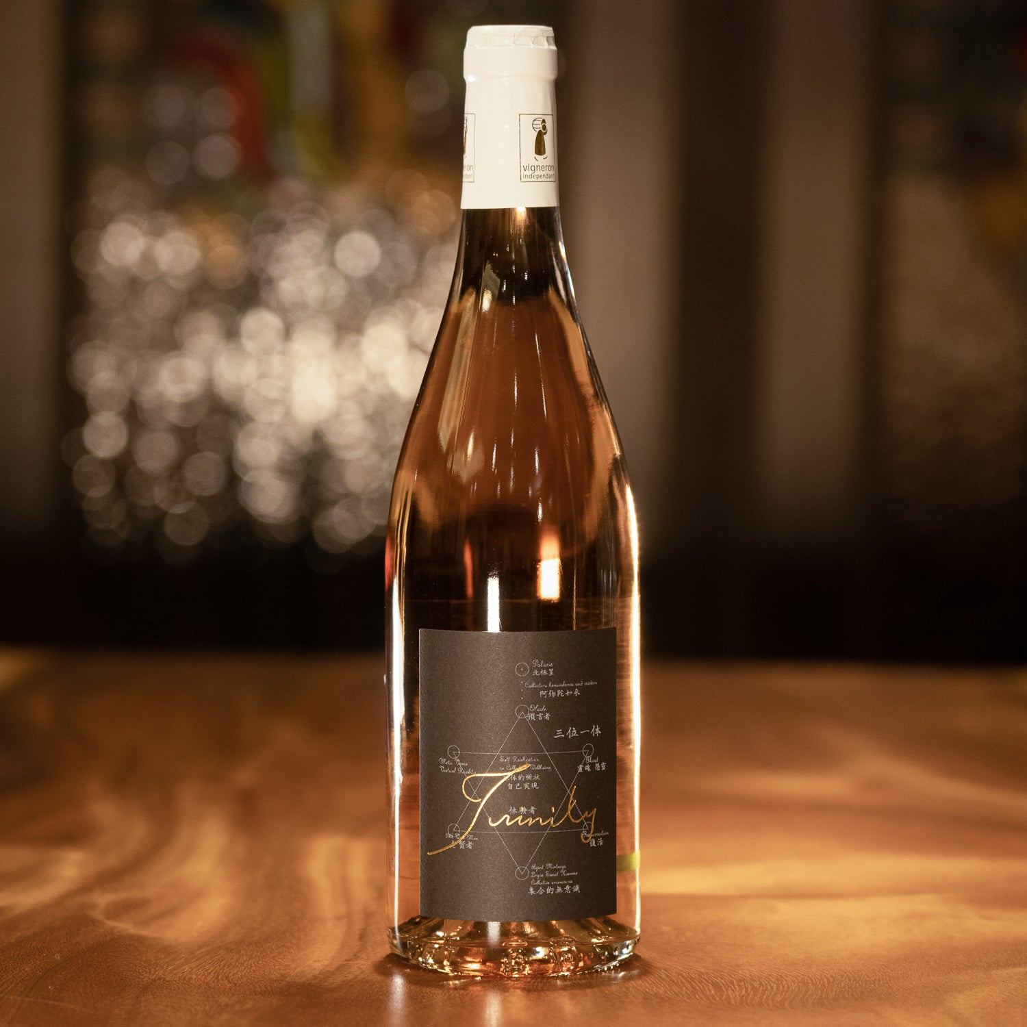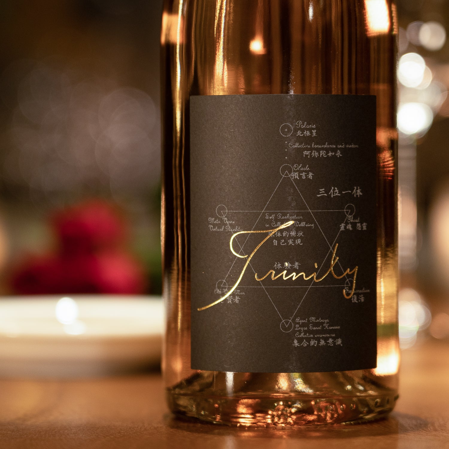ラベルに描かれた「TRINITY」の書は、北極老人の手によるもの。