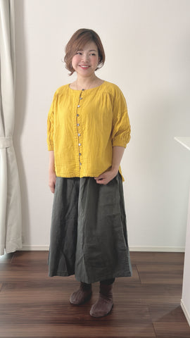 リネンのシャリ感が心地よいフレアパンツ です。暑い時期も風通し良く着られます。ウエストはひもで調整できます。