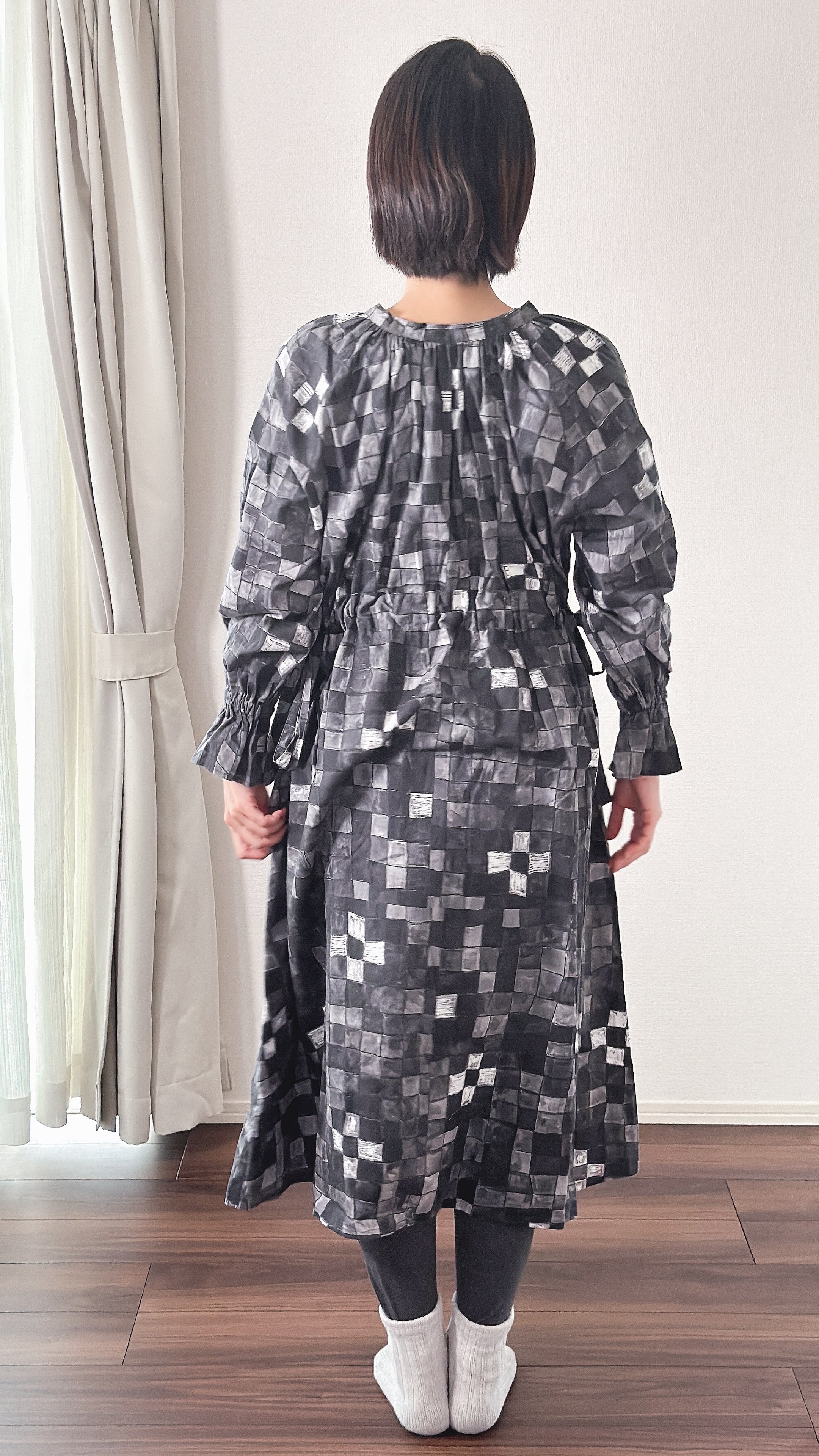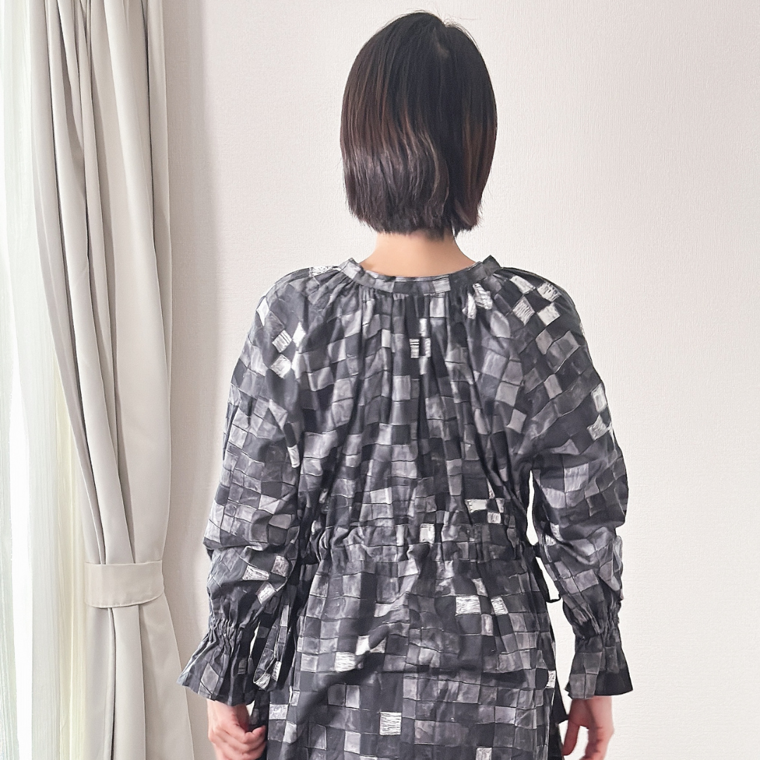 首元のリボンは前側で結んでも後ろ側にしても。後ろにリボンを結ぶと首元がスタンドカラーになります。