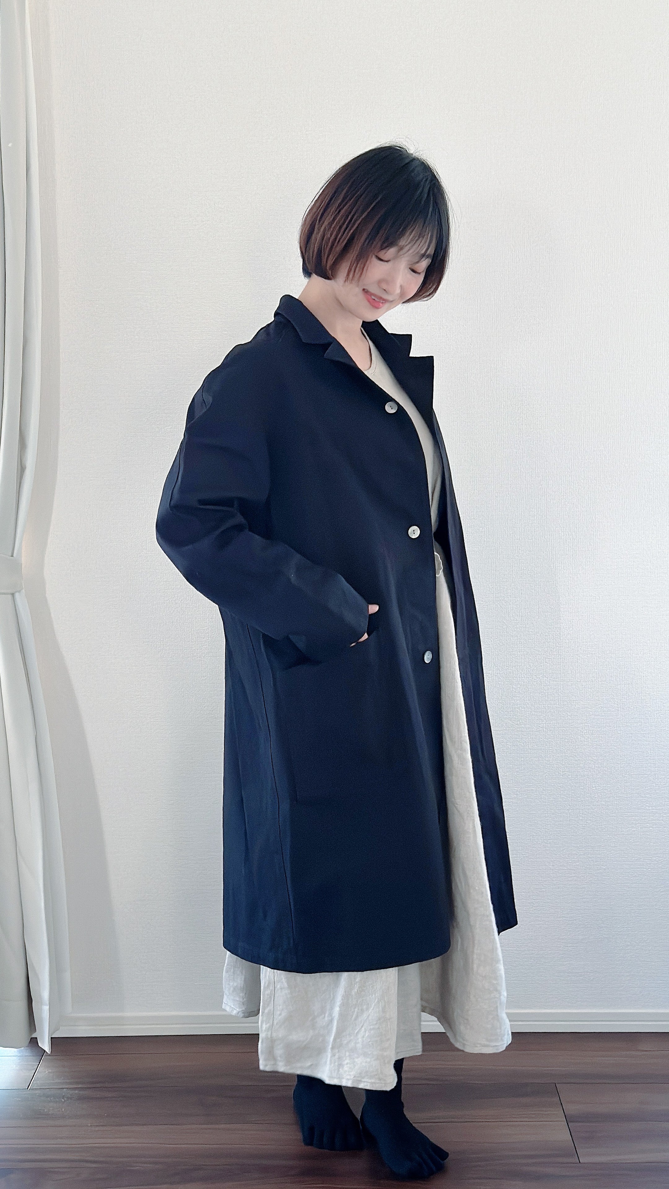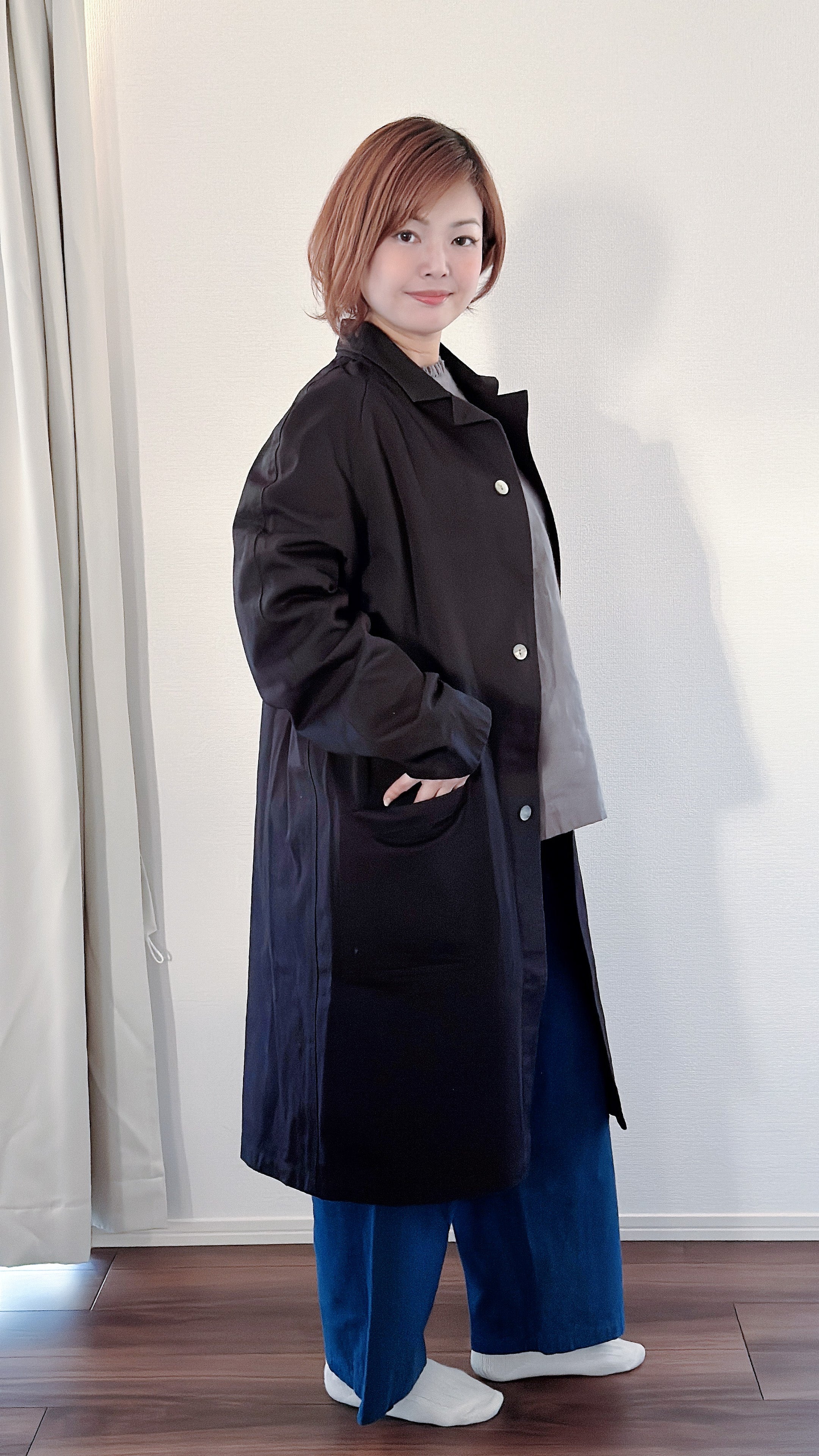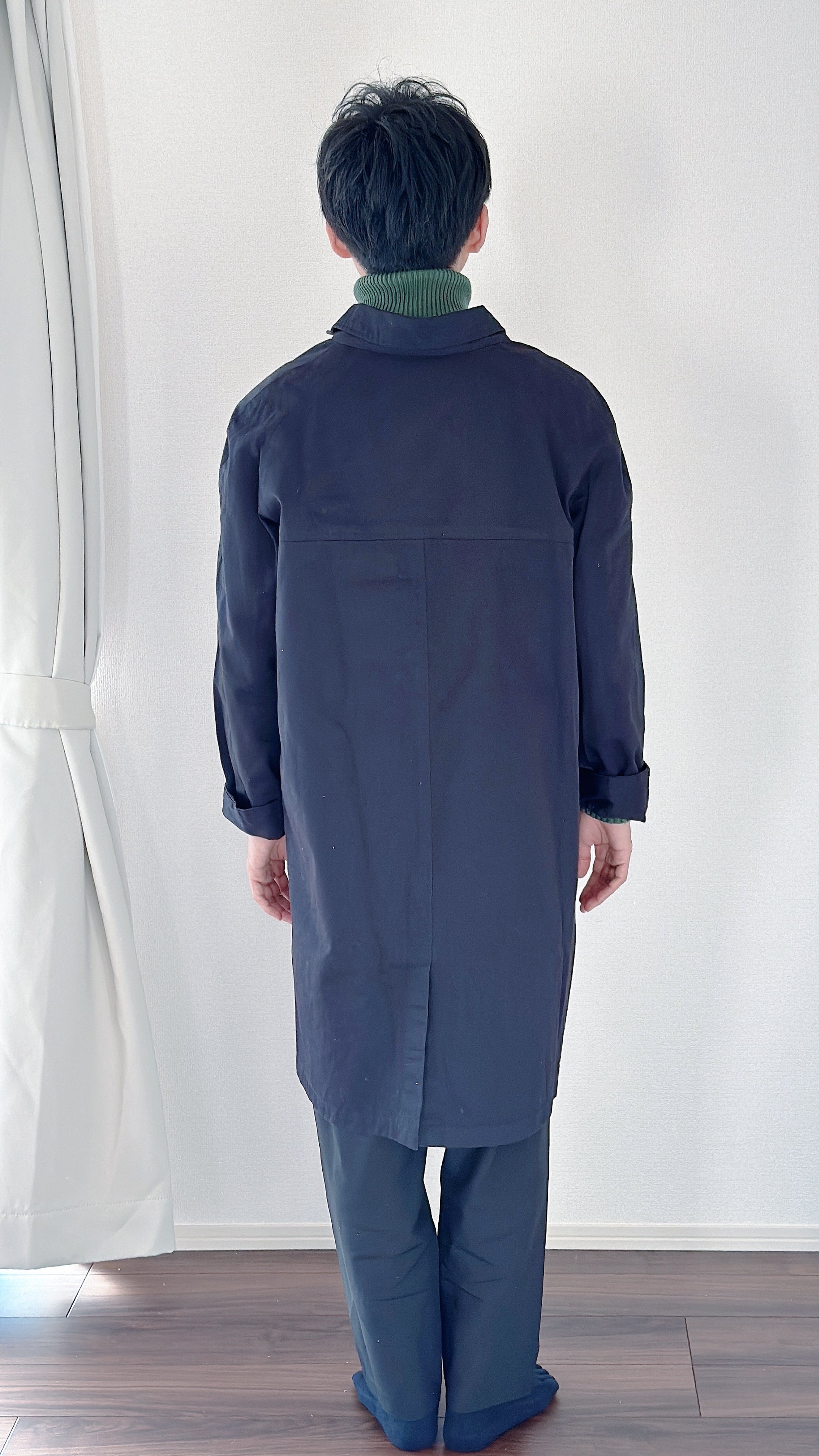 シンプルなシルエットなので、どんな服とも合わせやすいコートです。