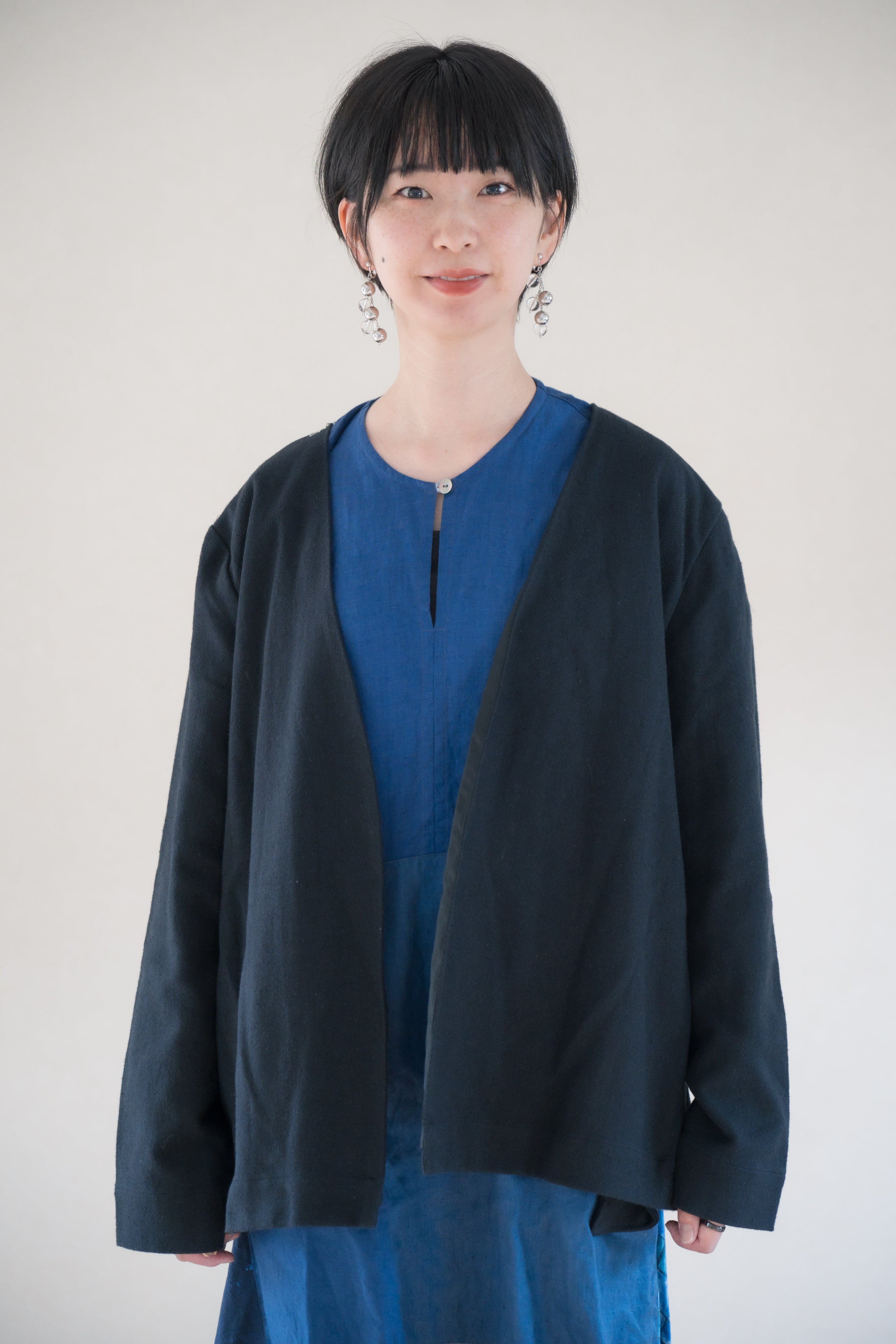 ノーカラーで柔らかい雰囲気のジャケット