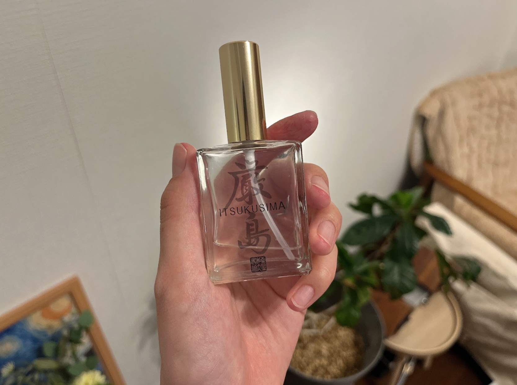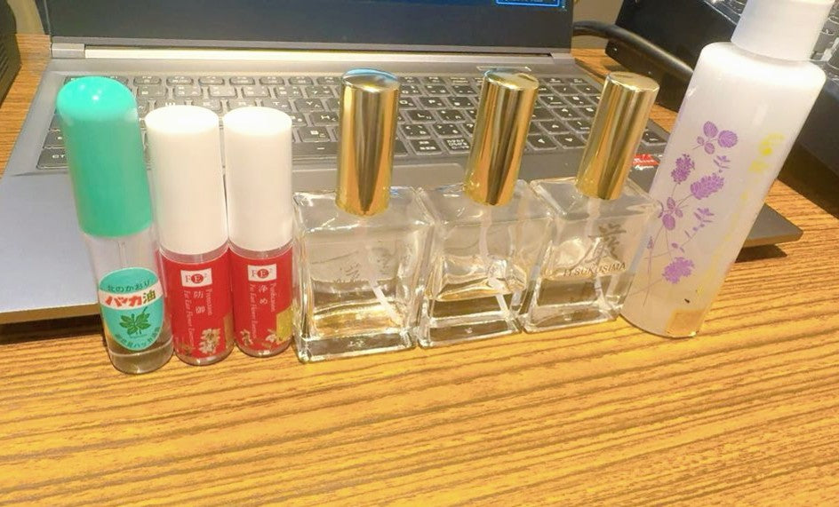 このセット(写真)は、どこかへ出張にいく際や、撮影スタッフとして撮影したり機材を扱う際に、僕にとってかかせないセットです。ハッカ油は、ちょっと疲れてきたな、という時、意識をハッキリさせたい時に使います。口の中にスプレーすると刺激で元気になります。フラワーエッセンスは、「浄め」で、自分を浄め、「防御」で、まわりの影響を受けにくくします。香水も3種類気分によって使い分けており、特に、厳島の香りは、柑橘系の爽やかな香りで目がさめて、スキッとします。これらは、基本自分に対して使うのですが、リフレッシュメントスプレーは、空間に対して使うイメージです。空間を整えてくれます。