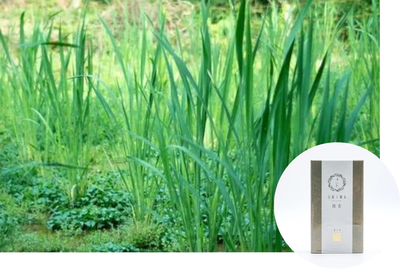 「 備長炭麗 ゆにわのお線香 樹木の香り」に続き、ゆにわと梅薫堂が共同開発したのが、こちら「マコモ」のお線香です。