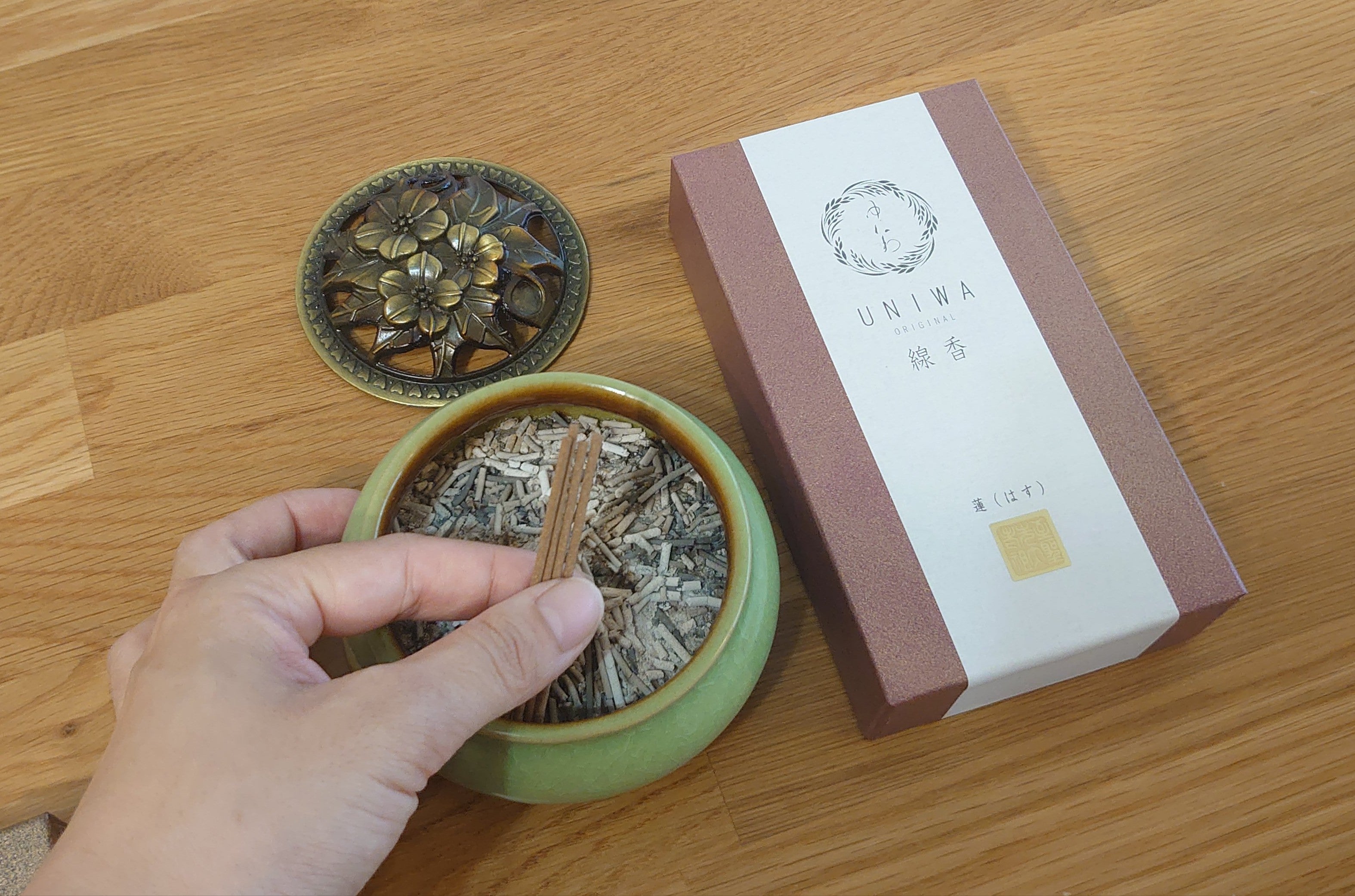 (ゆにわのお線香の「蓮」の香りや「まこも」の香りは、それ自体の香りが強く、香りが混ざってしまうため、この使い方をする場合は、香りや煙が弱い「樹木」の香りとの組み合わせをおすすめしています。)