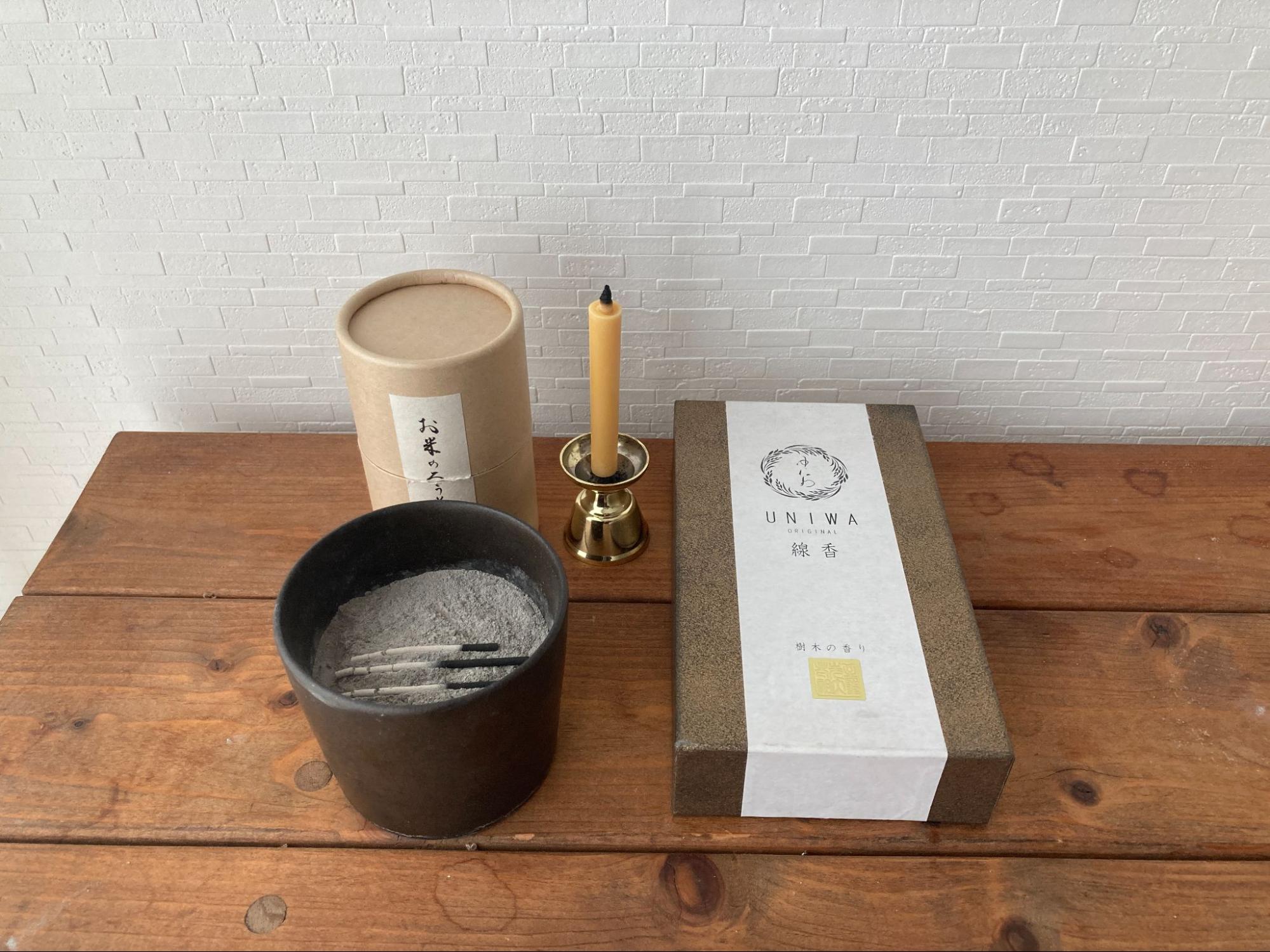 ゆにわマートでも販売している「美爐空(みろく)キャンドル」や「お米のろうそく」で火をつけていただくことで、よりお線香の浄化力を感じていただけると思います。