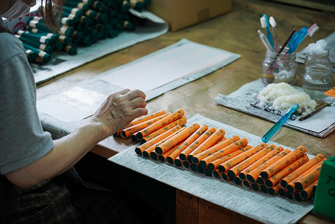 この「巻く」工程は、最初は、素麺に紙を巻く機械でできないか試したそうですが、機械を使うと線香が何本か折れてしまいました。