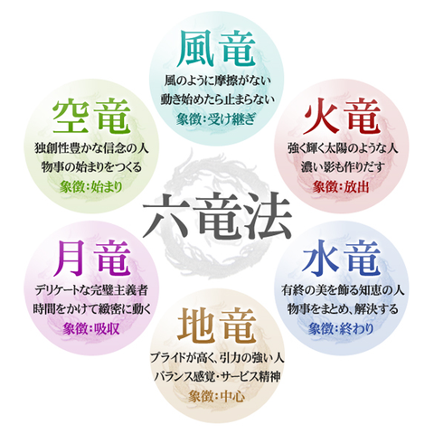 ここで言う“龍”とは、エネルギーの流れのこと。あなたの生まれた日によって、自然界のエレメント「風・火・水・空・月(夜)・地」の六種類の特徴に分けられます。