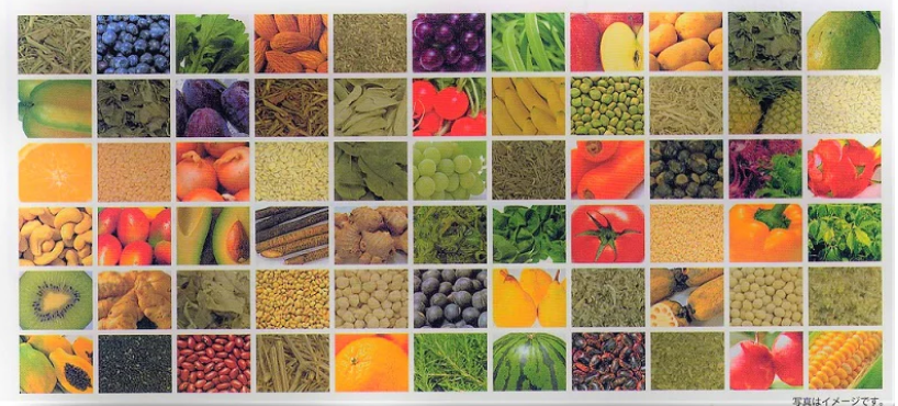 | 原材料名 | 植物発行物[果実・野菜(オレンジ、パイナップル、バナナ、パパイヤ、グアバ、人参、キウイフルーツ、リンゴ、その他)、穀物(玄米、フェイジョン豆、トウモロコシ、オーツ麦、エンドウ豆、黒ゴマ、キビ、大豆、ライ麦、レンズ豆、小豆、カシューナッツ、その他)、野草エキス(ローズマリー、キャッツクロー、その他)、海藻(わかめ、昆布、海苔)、黒砂糖]、果糖、ガラクトオリゴ糖、レンコン末、ガジュツ末、乳酸菌(デキストリン、還元澱粉糖化物、乳酸菌) |