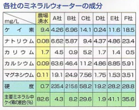 この湧水は、他のミネラルに比べてケイ素の含有比率が高い独特なミネラルバランスを持っています。