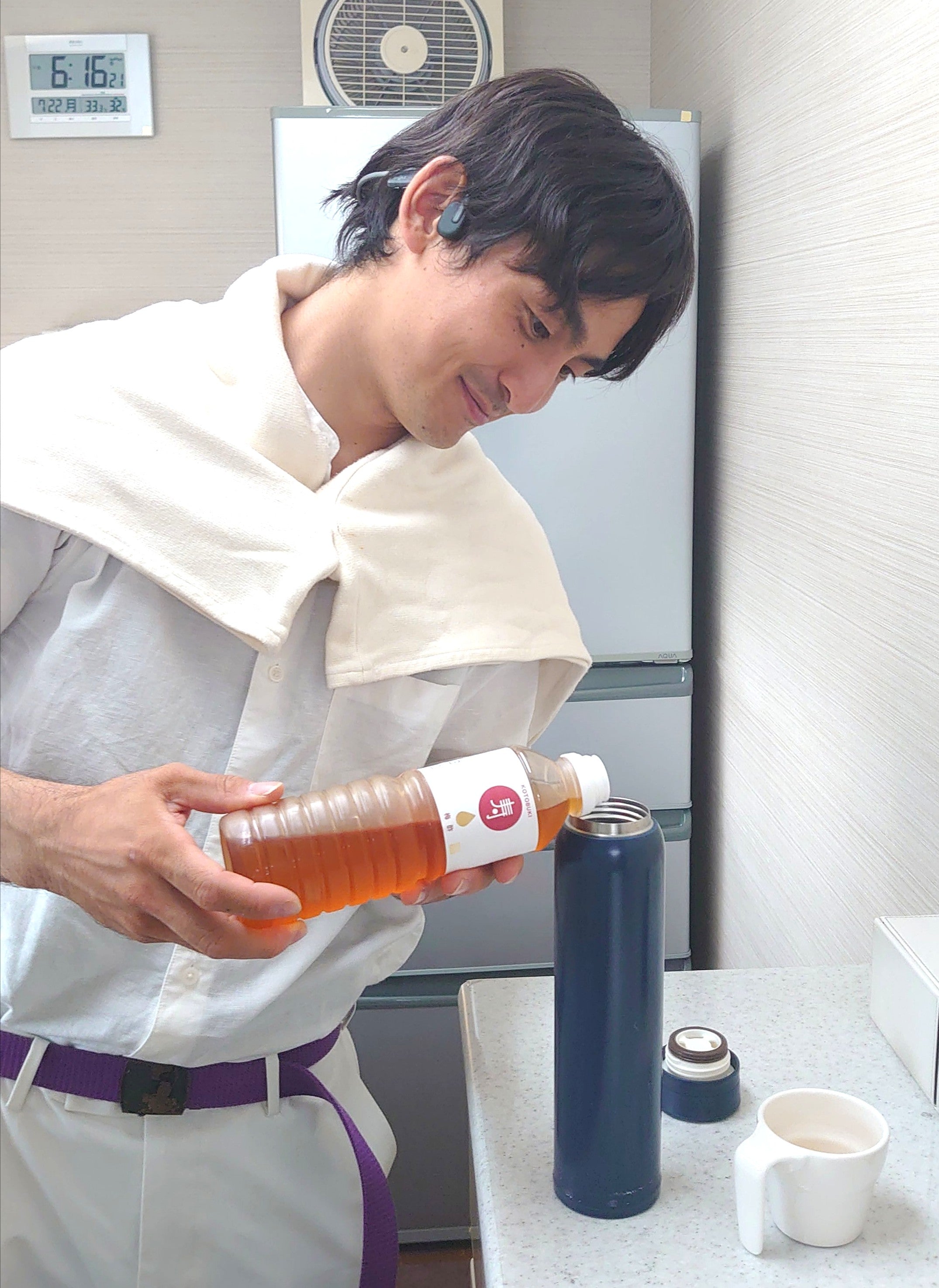 1年を通して、梅酢と出汁スープと塩を少し入れて特製ドリンクにして飲んでいます。出汁スープは、もともと飲んでいたんですが、ある時梅酢も加えると、さらに美味しくなったので、その組み合わせで飲んでいます。夏場は、梅酢と米飴と氷水と少しの塩を一緒に入れて、これまた特製ドリンクとして飲んでいます。僕は仕事柄、外作業が多いので、水だけでは喉の渇きが癒えません!そんな時、梅酢と一緒に飲むととってもいいです。夏場は、塩(キパワーソルト)を舐めるか、梅酢を飲むかで乗り切れます。