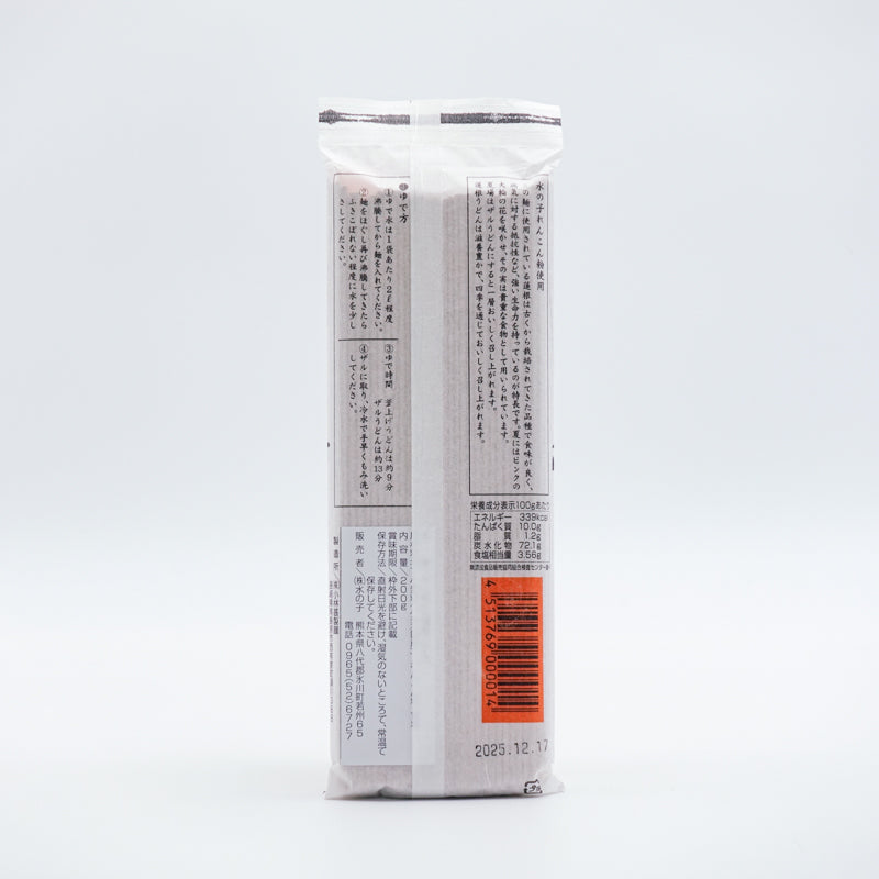 農薬や化学肥料未使用で育てられた「水の子会」の蓮根と、国産の小麦粉を一緒に練り合わせて作った乾燥うどんです。
