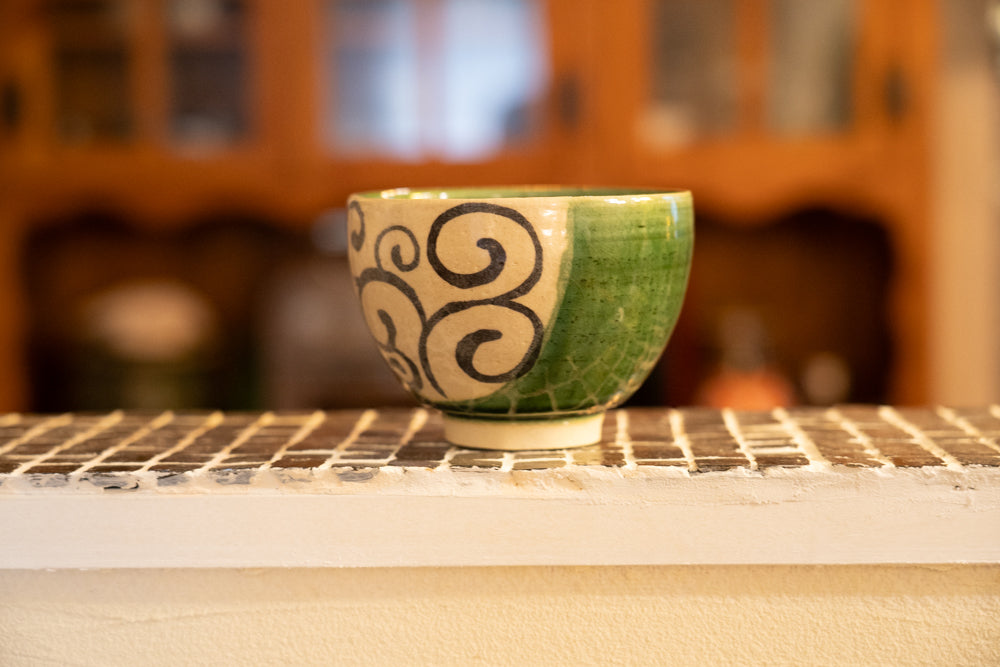 この織部焼の茶碗には、緑と黒の2種類あるんですが、その働きは陰と陽のように働きに違いがあるそうです。緑は、自分の肉体の状態が映し出され、黒は、自分の精神の状態が映し出されるそうです。
