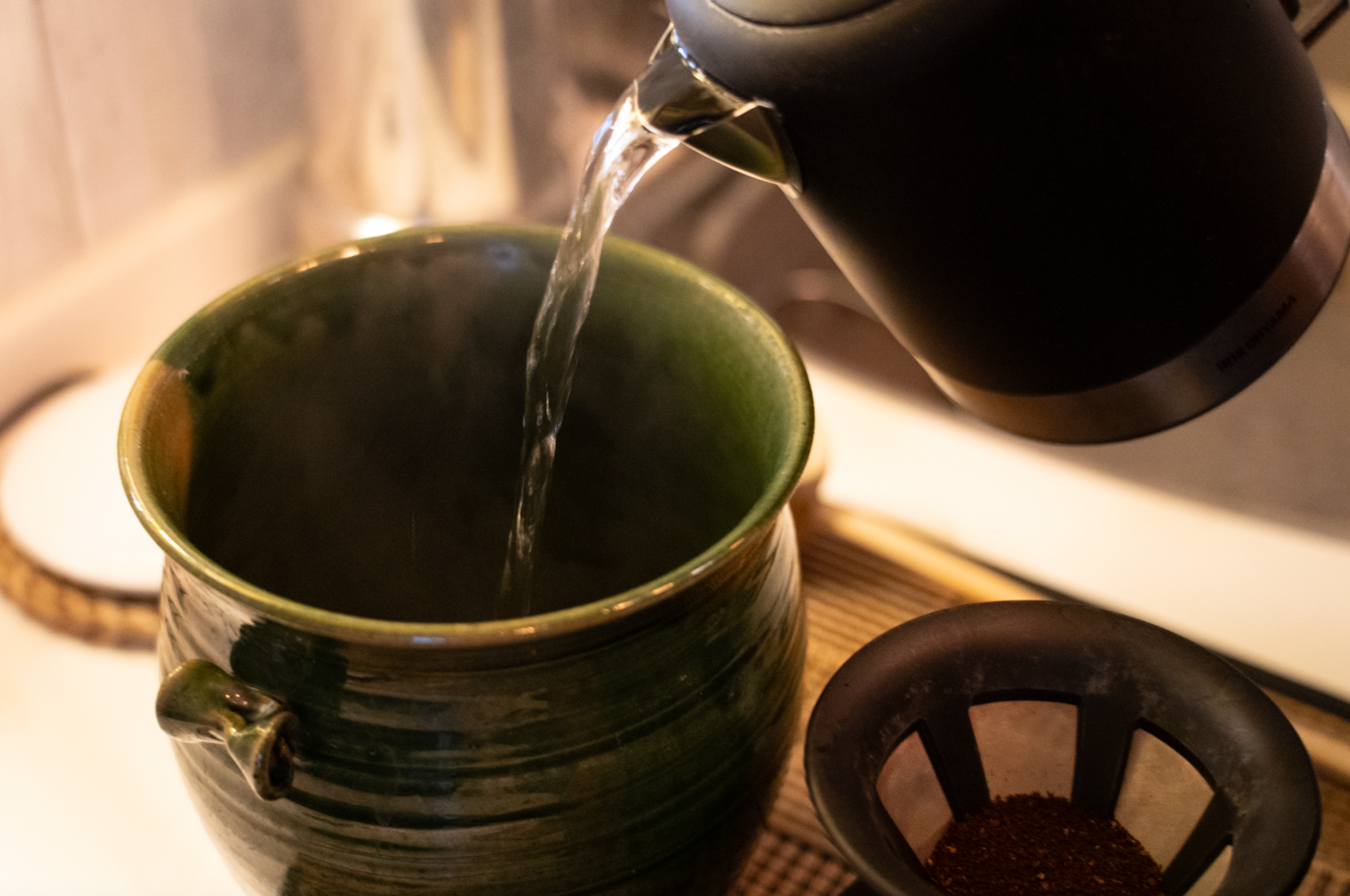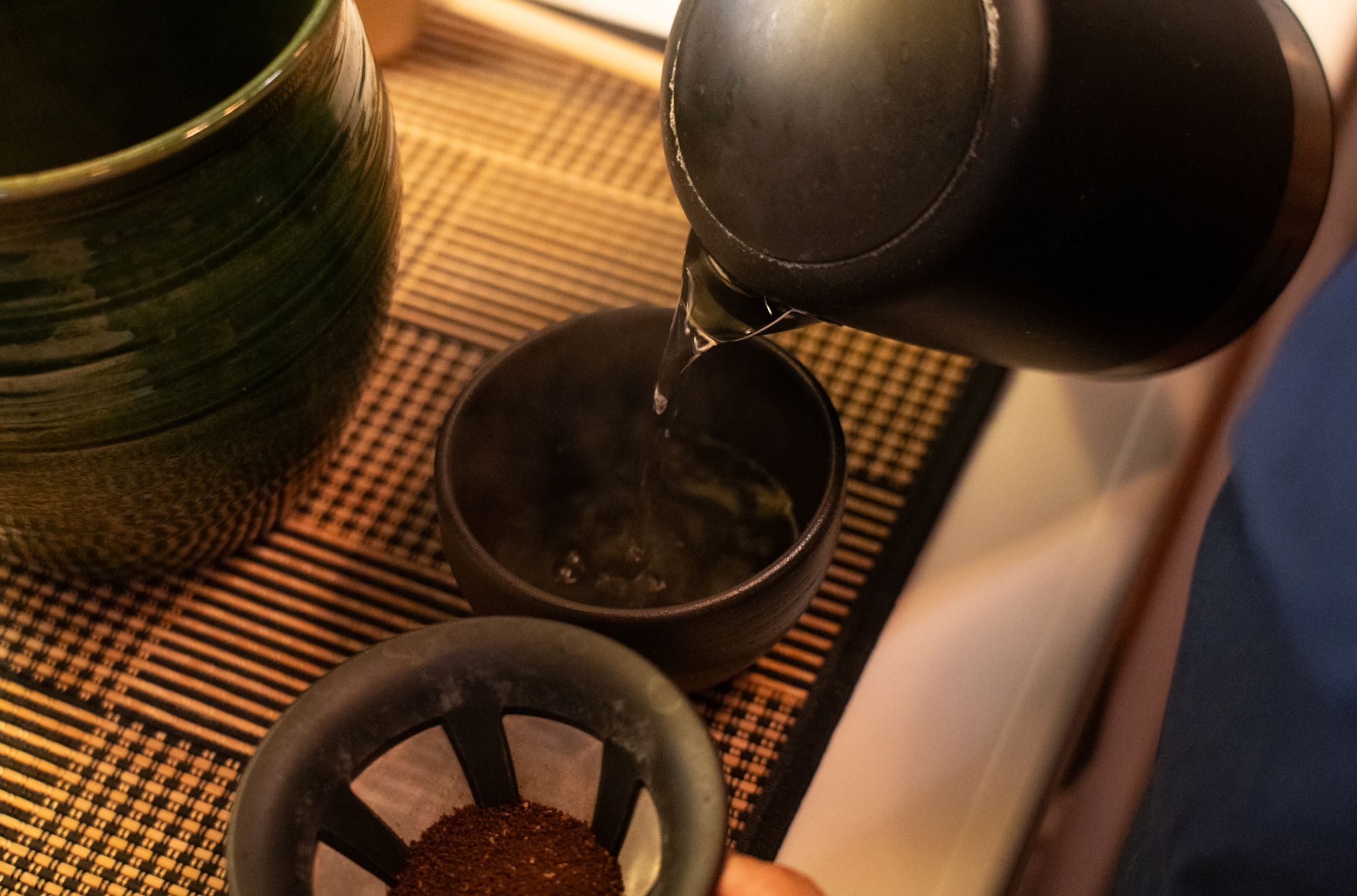 甕のお湯はコーヒーをドリップするために使うもので、茶碗のお湯や茶碗自体を温めるためです。(※甕は万福たけしの私物です。)