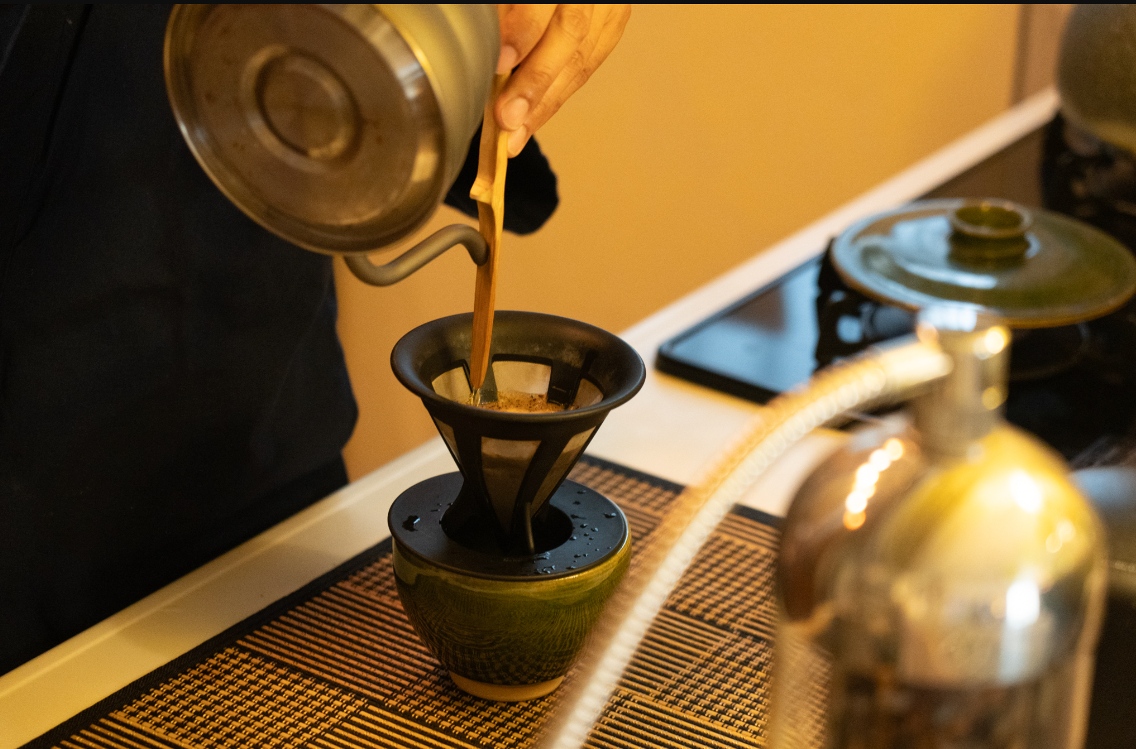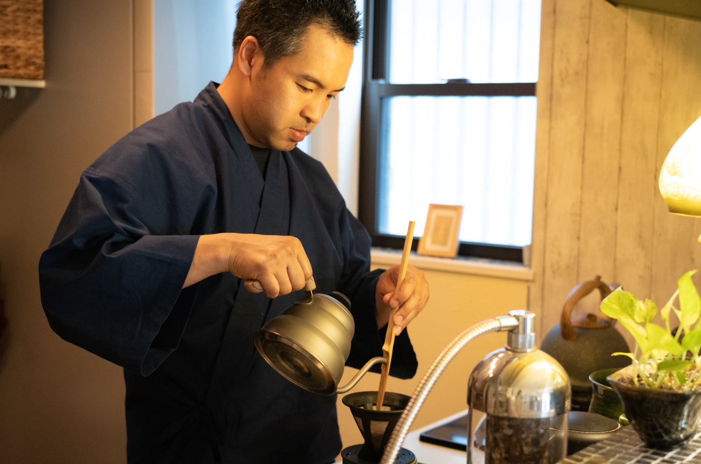 ちなみに竹という素材は、”気”をうつす性質があるとも言われています。だからその人の気が入るんですね。右手と左手、それぞれで竹笏と柄杓を持ち淹れていく。一回淹れるたびに、右手と左手とを持ち変える。私(万福)は、週に3回くらい淹れています。淹れるたびに自分の状態が整っていく感覚です。自分の状態もわかるので、今日はこう軌道修正しようとか、こうしていこうとか。あと、竹尺により、お湯も柔らかくなって、普通のコーヒーとはまた違ったおいしさがありますね。