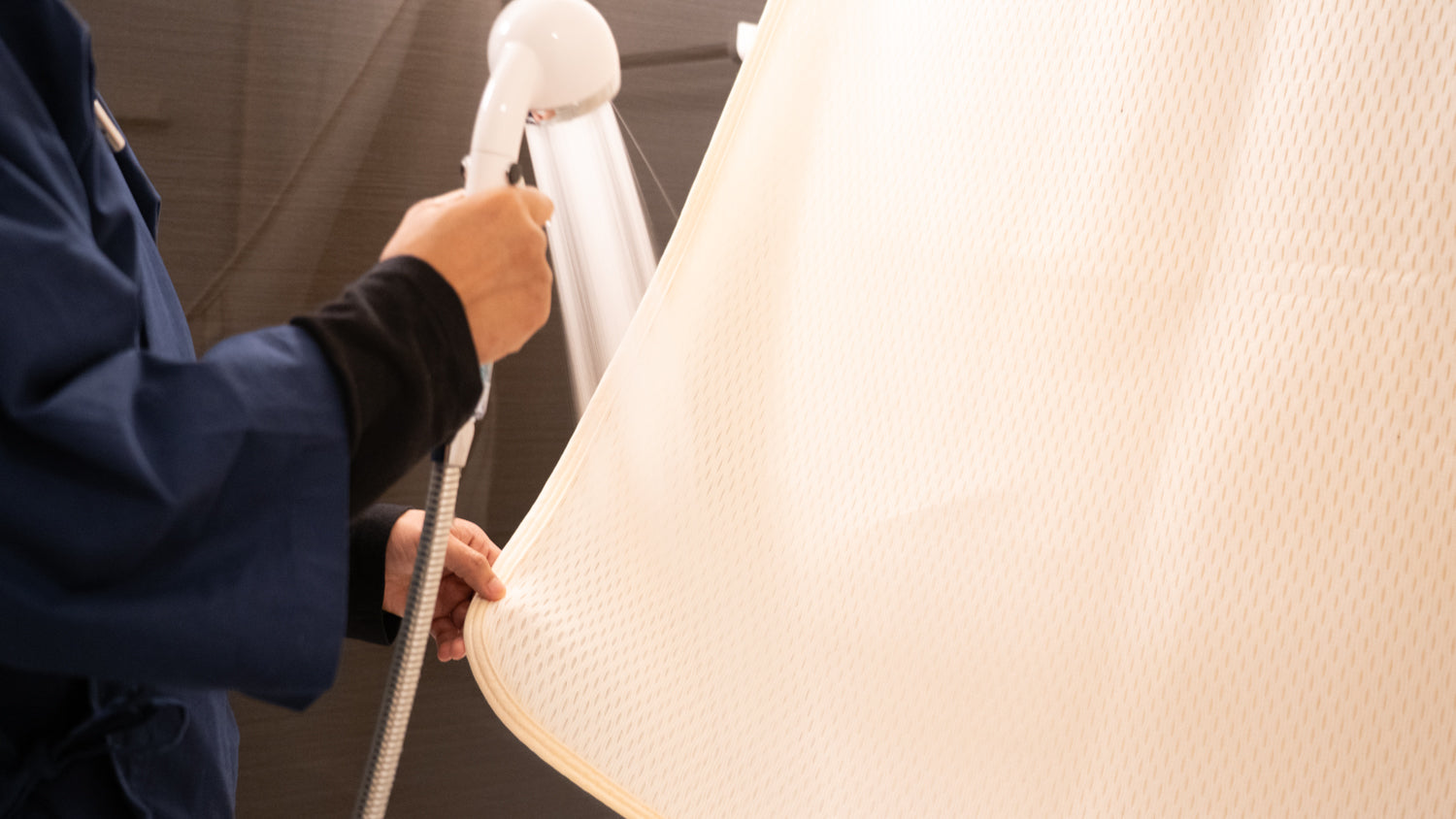 水洗いができるので、清潔にお使いいただけます。お風呂場のシャワーで洗い流すのが、簡単でおすすめ。そのまま浴室内に干し、換気扇を回しておくと短時間で乾きます。