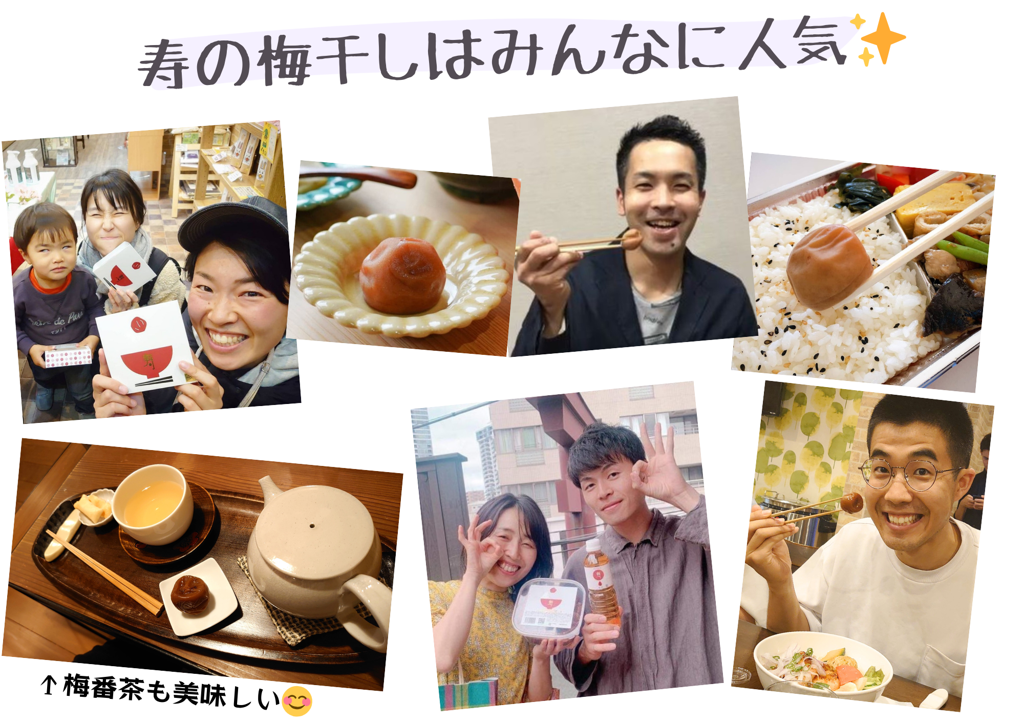 勝尾しょうごさんいつも、元気をもらっています。元々、梅干しが嫌いで食べれなかったのですが、寿の梅干しは、おいしい!と感じ、食べれるようになりました。完全無添加で作られており、梅のフルーティーな、とても上品な風味がします。朝、眠気が取れずあまり元気が出ないな、、というときに一粒食べると、全身から、エネルギーが湧き上がってきて、とても元気が出ます! 疲れて力が出ない、、 そんなときに、ぜひ寿を一粒、パクッと食べてみてください!心から元気になれる、そんな梅干しです!