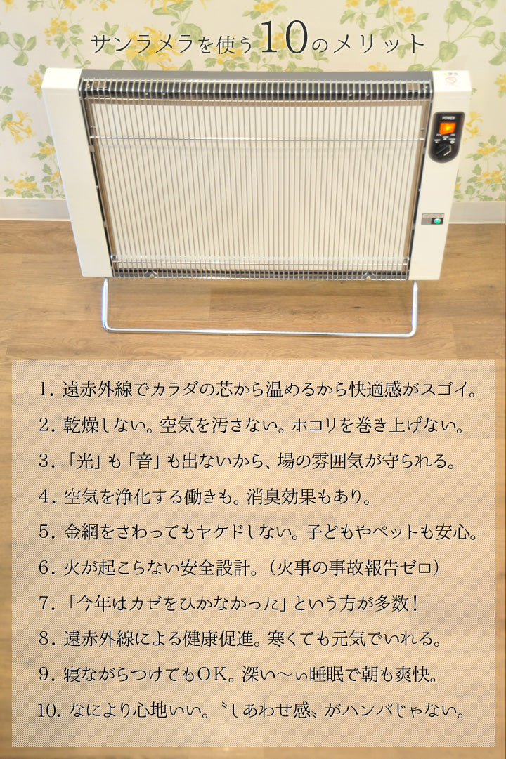 - 遠赤外線は空気を暖めず、直接人体に作用しますので、サンラメラの前でじっと遠赤外線を浴びていれば、部屋の広さにかかわらず体の芯からポカポカする感覚がありますが、寒冷地や極寒の時期のご使用では補助暖房としてお考えください。
