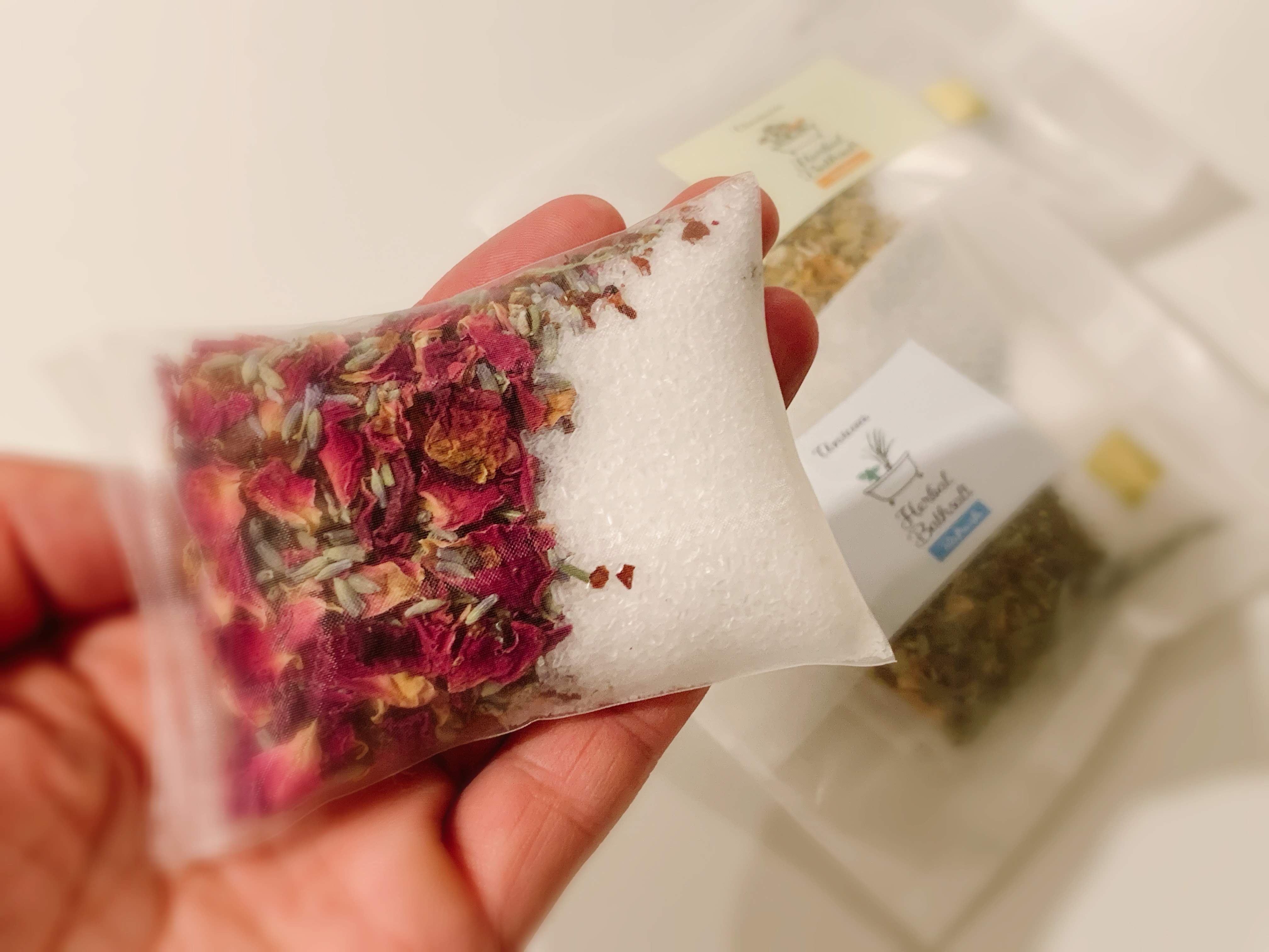 ※写真は、バスシリーズ「ビューティー」「大地のりんご」とも呼ばれる、甘い香りのジャーマンカモミールと、華やかな香りのオレンジピール、デトックス作用があると言われるマリーゴールドを合わせました。