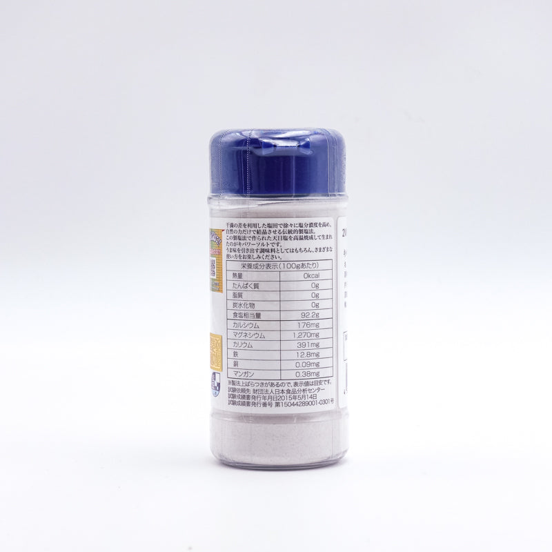 栄養成分表示(100gあたり) | エネルギー0kcal、たんぱく質0g、脂質0g、炭水化物0g、ナトリウム37.9g、カルシウム1.84g、マグネシウム7.61g、カリウム2.08g、鉄4.04mg、銅0.04mg、マンガン0.48mg |